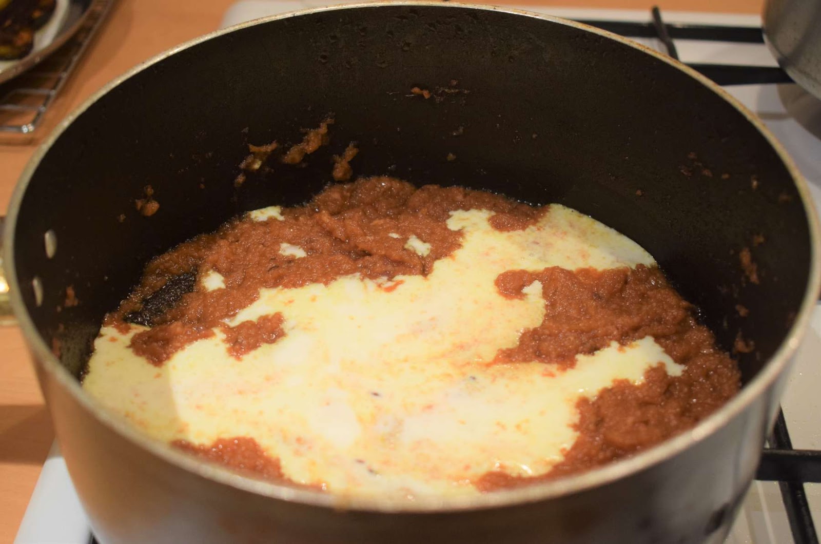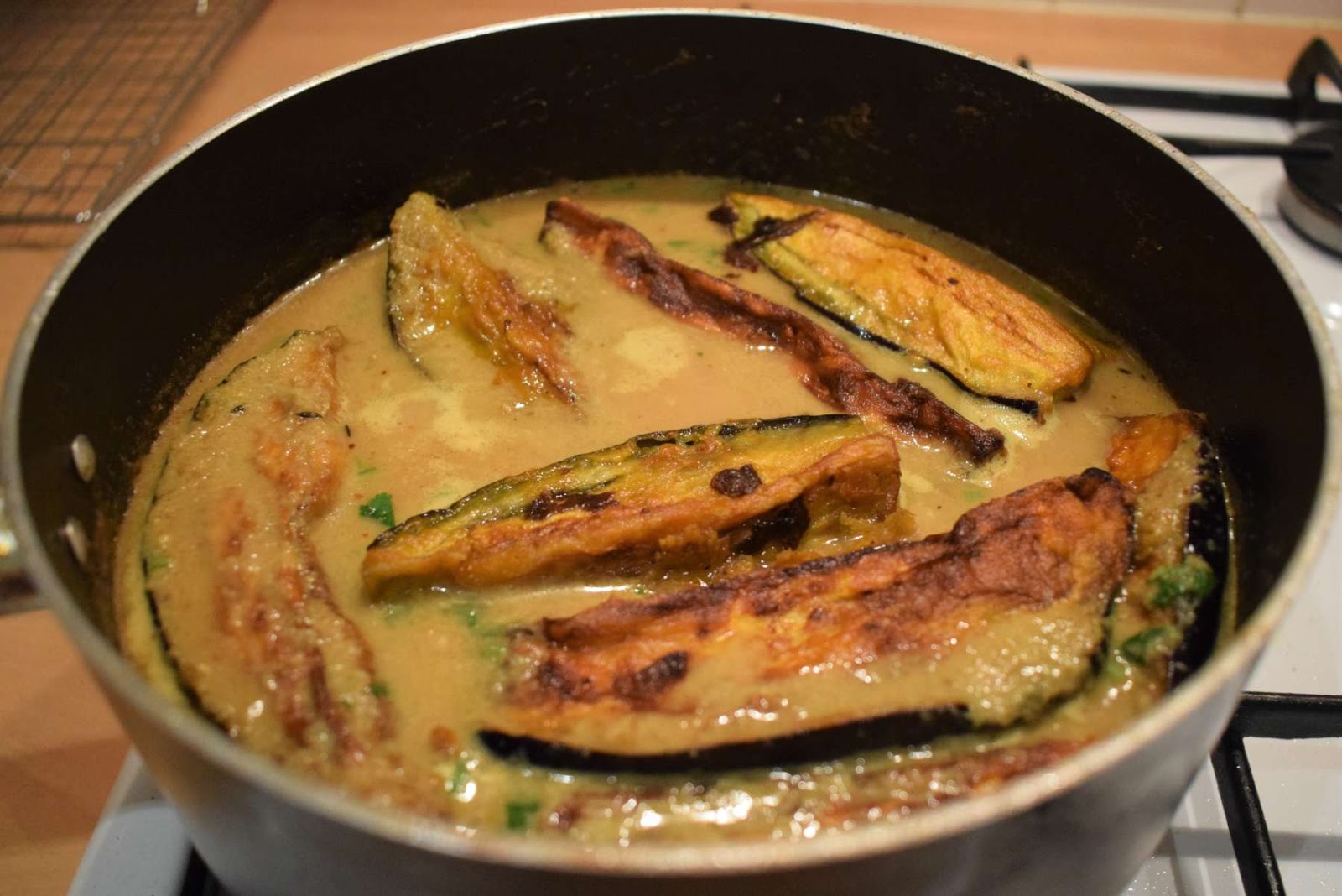 - Put the flame in low and add the shallow fried Aubergine slices (Step 11) into the gravy.