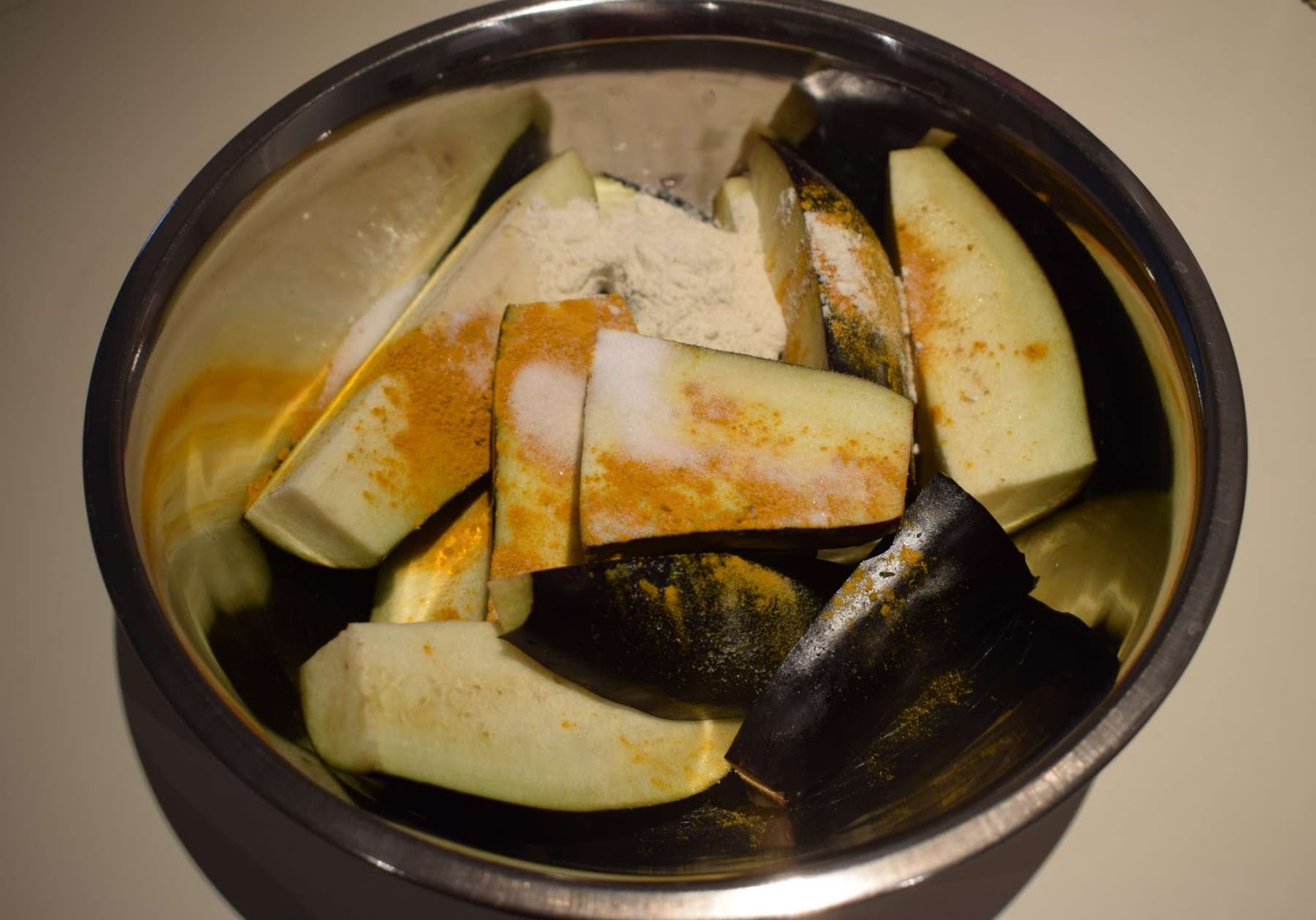 - Sprinkle Salt, Turmeric powder and all-purpose flour on the Aubergine slices.