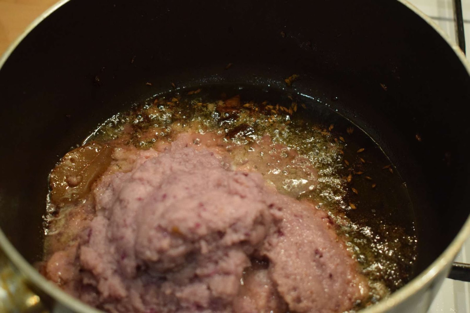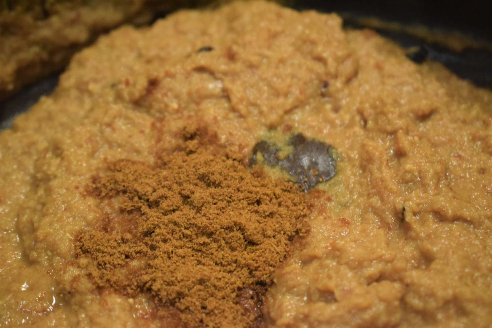 - Put the flame in low and add the masala paste (Step 6) into the pan.