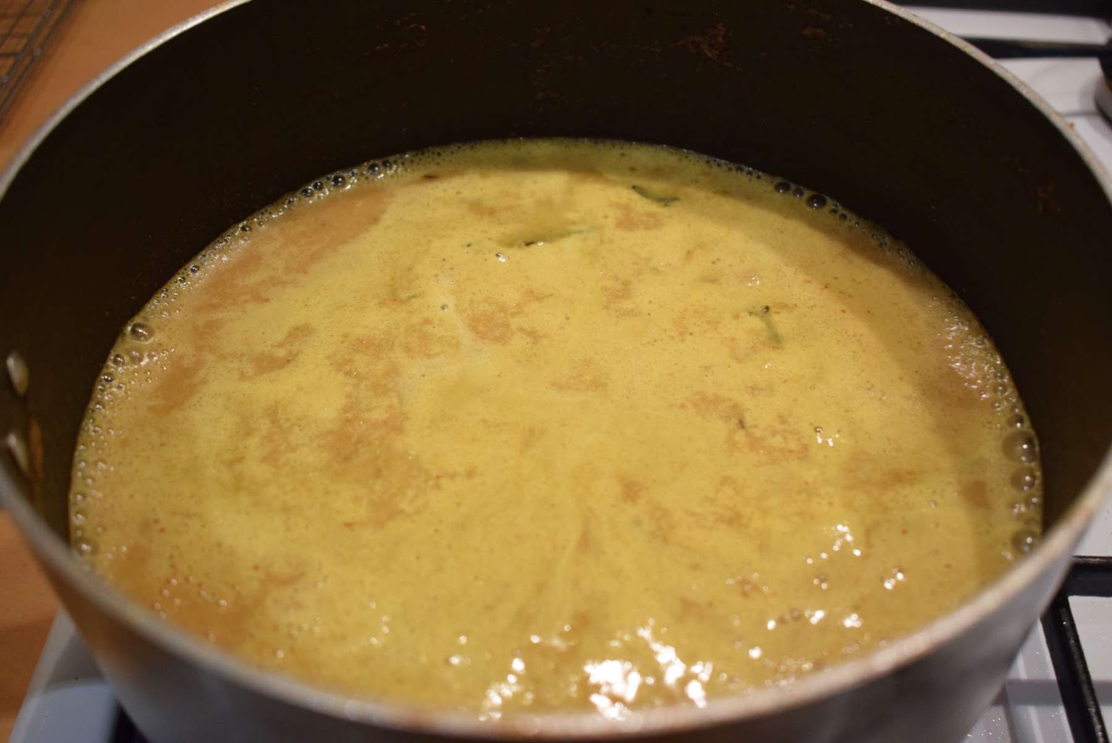 After cooking the masala paste with Yogurt for some time, I have added water to prepare the gravy for the dish. The shallow fried Brinjals are cooked in this luscious gravy. The consistency of the gravy for the dish is neither very thick nor very thin.