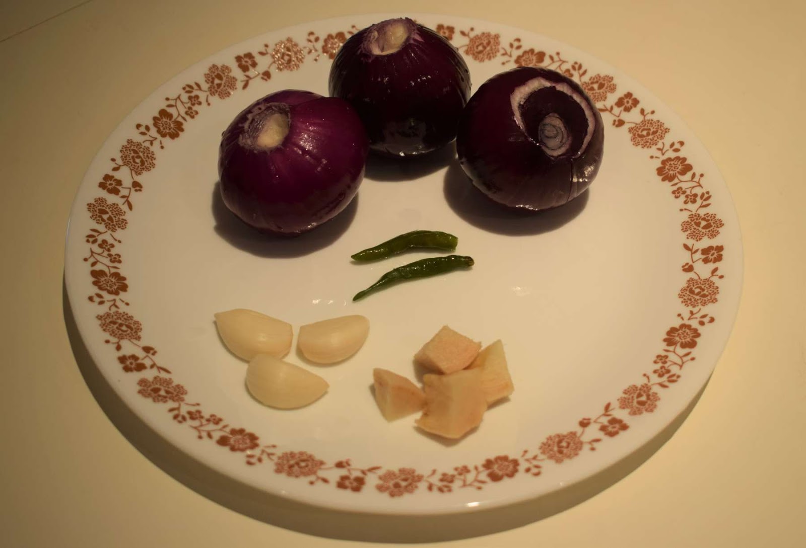 - On the other hand, add Onions, Ginger and Garlic cloves into the jar of a grinder or blender.