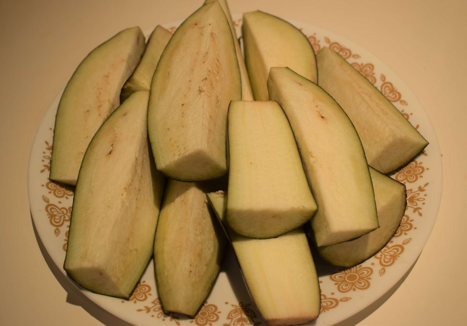 - Once the oil is hot, add Aubergine slices (Step 4) into the pan.