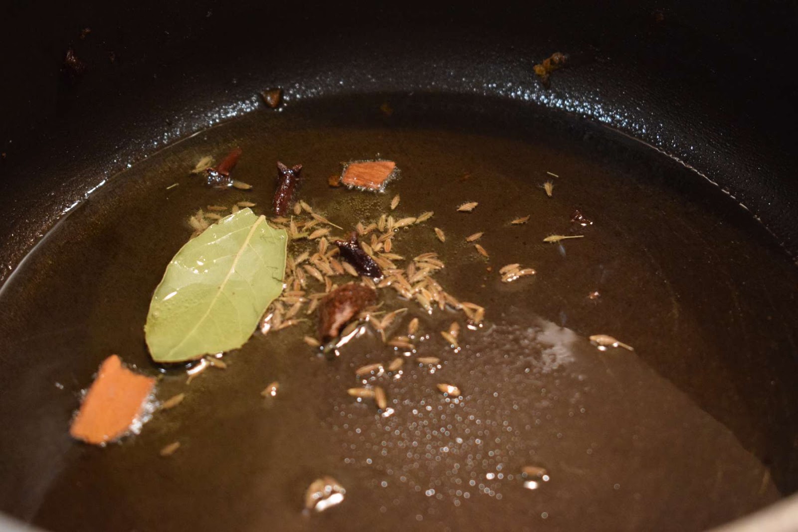 - Add Bay leaves, Cumin seeds, Cloves and Cinnamon stick into the pan and let them crackle.