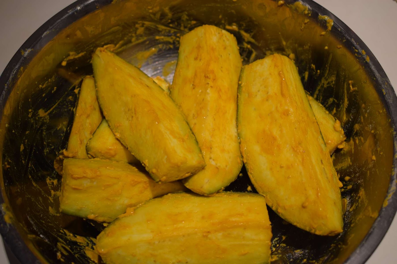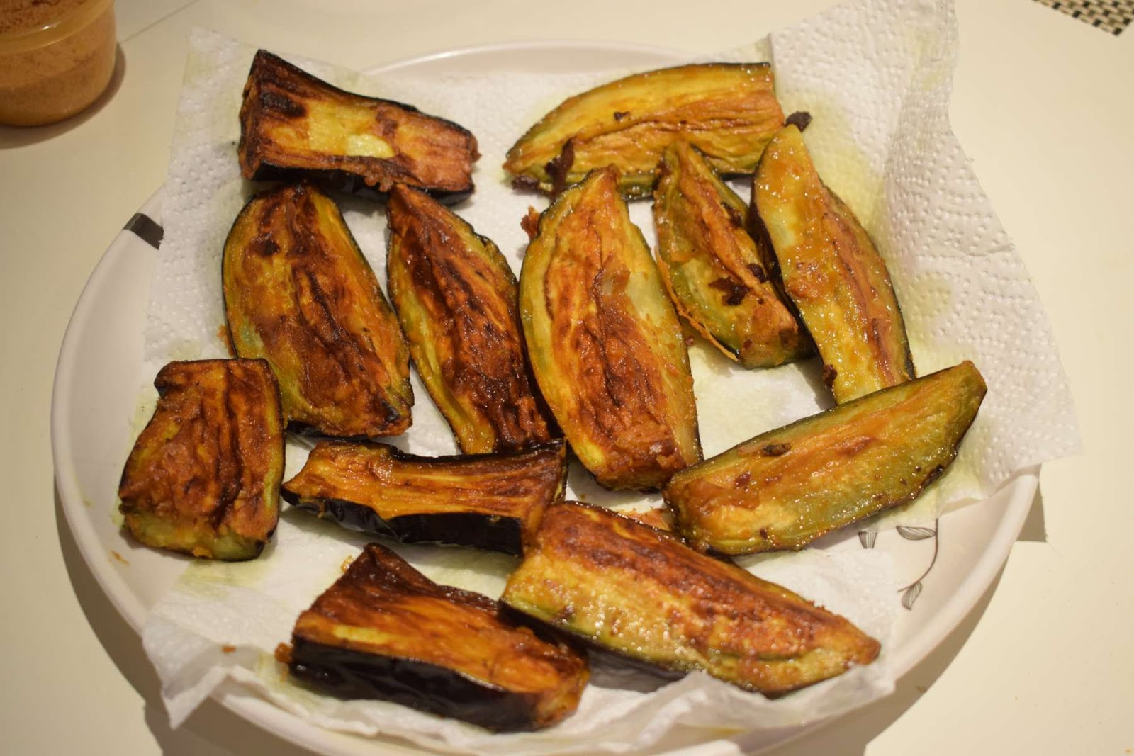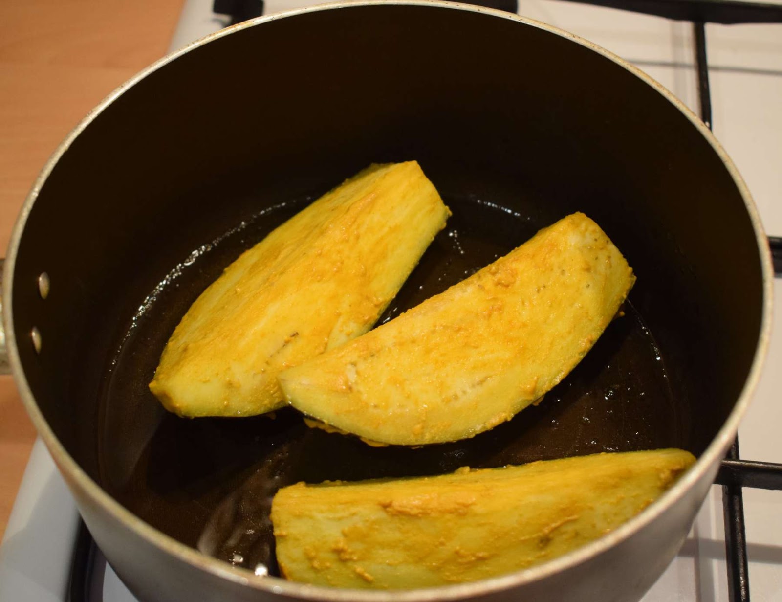 - Add Oil into a large pan for shallow frying the marinated Aubergine slices.