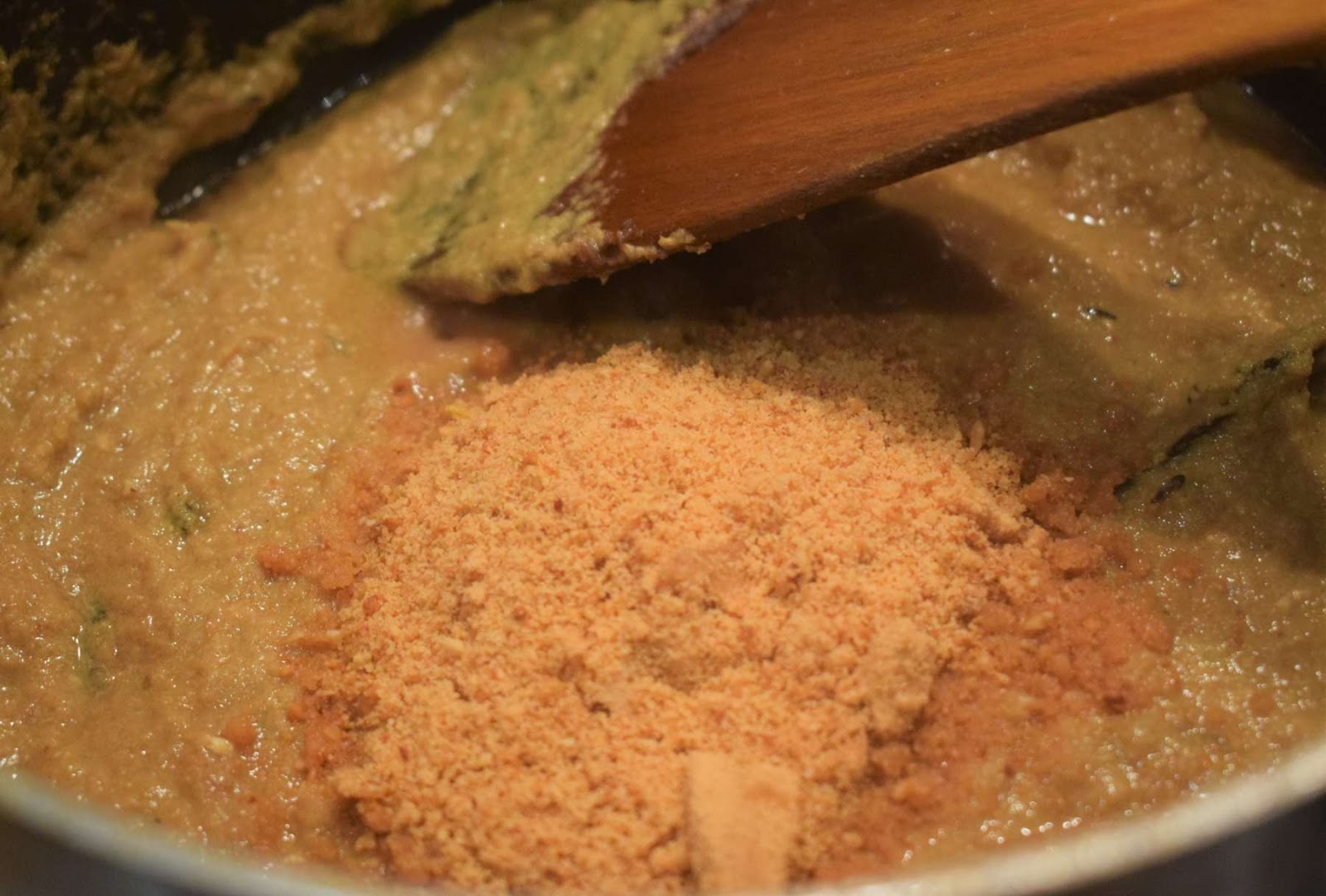 - Give a quick mix and add ground roasted Peanuts into the pan. Mix all the ingredients nicely.