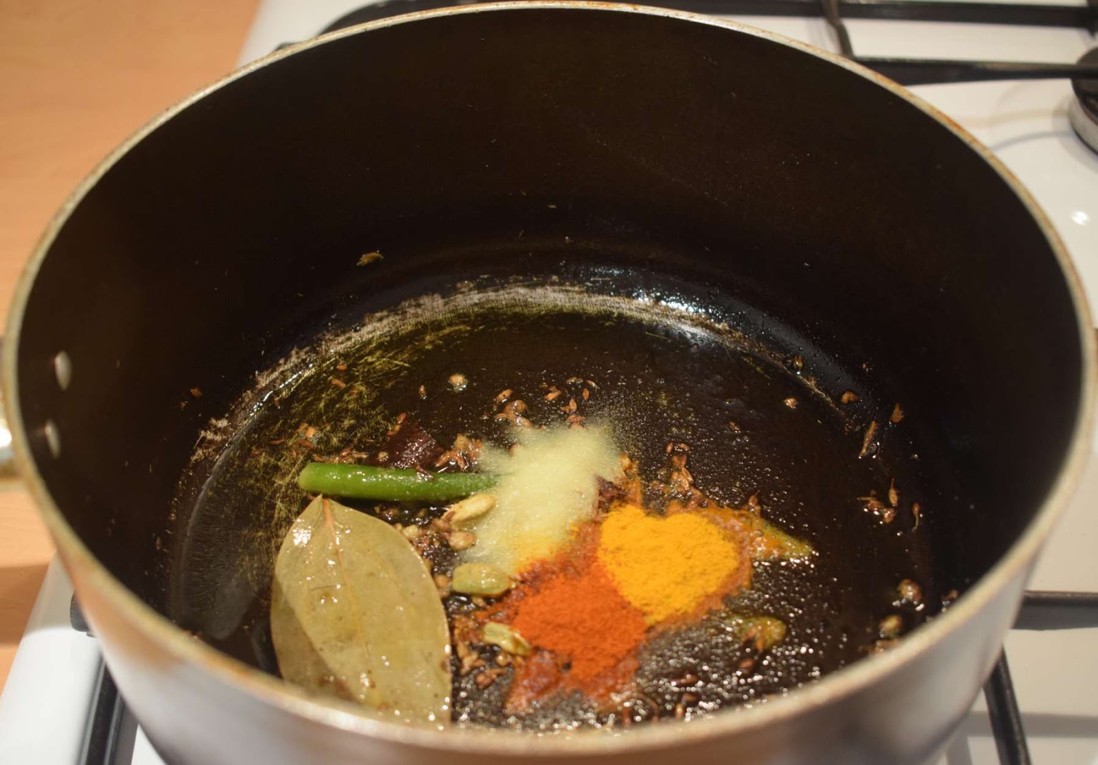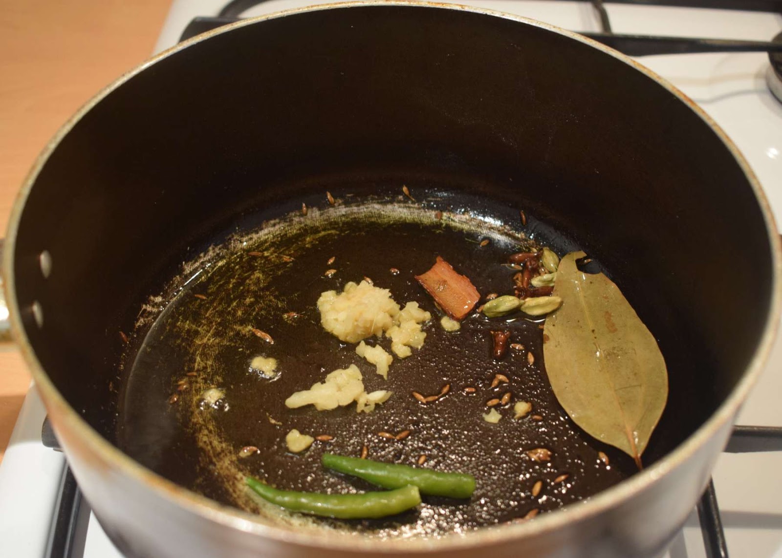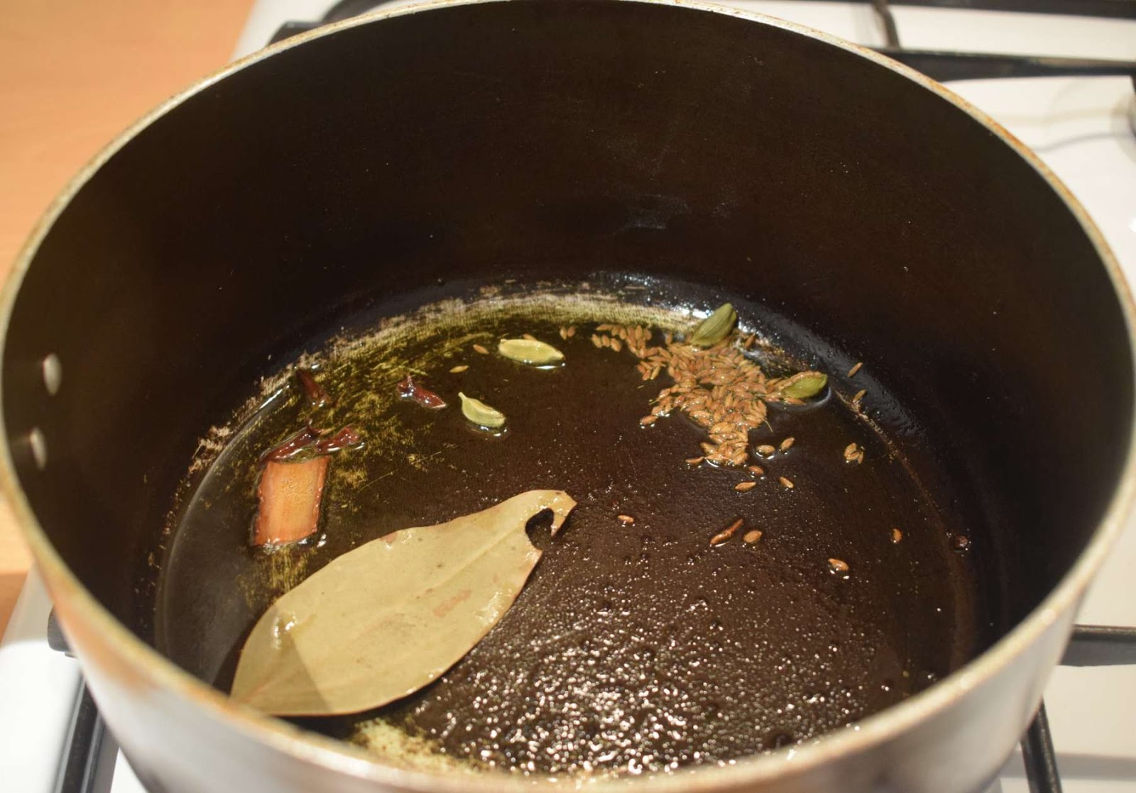 - Add bay leaves, cumin seeds, cloves, cardamoms and cinnamon stick into the pan and let them crackle.