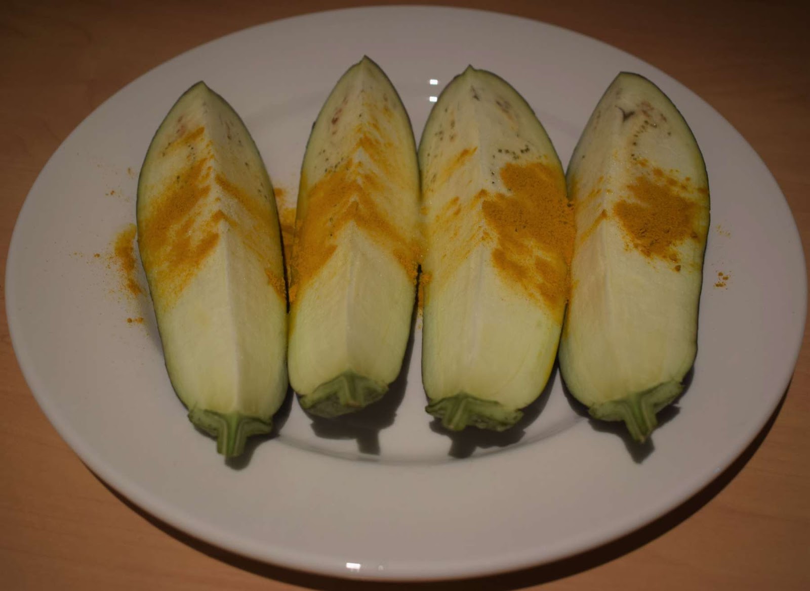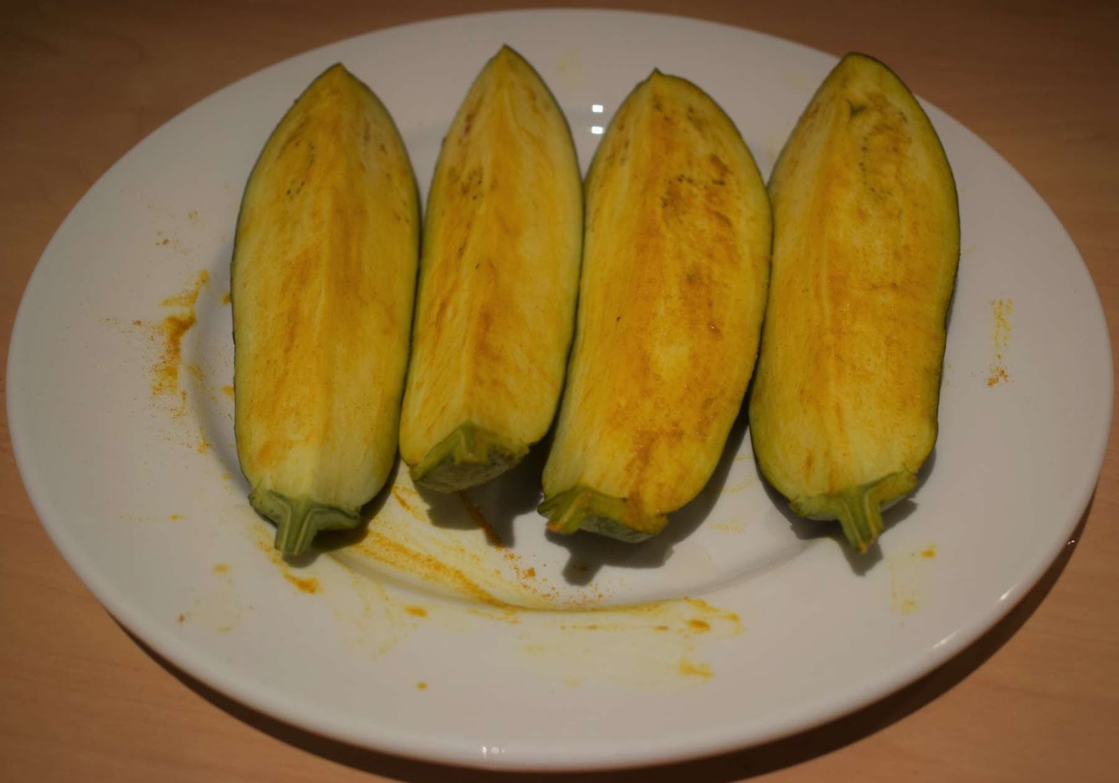 - Rub them evenly on the eggplant pieces and allow the pieces to marinate for at least 10 minutes.