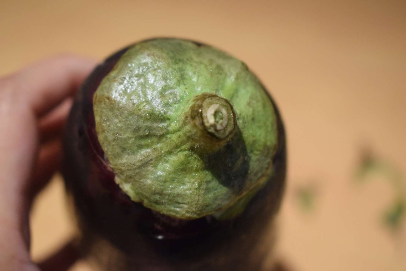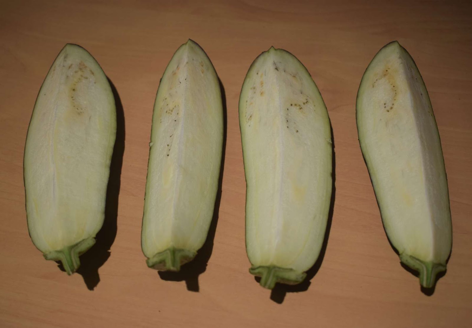 - Trim the edges of the stem of eggplant. Cut the eggplant lengthwise into 4 pieces with the stem.
