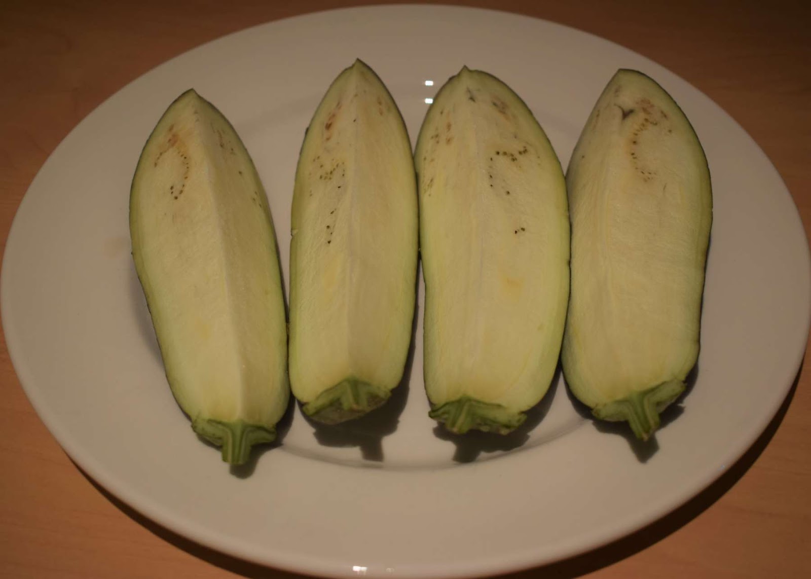 - 1 large Eggplant, cut lengthwise into 4 pieces