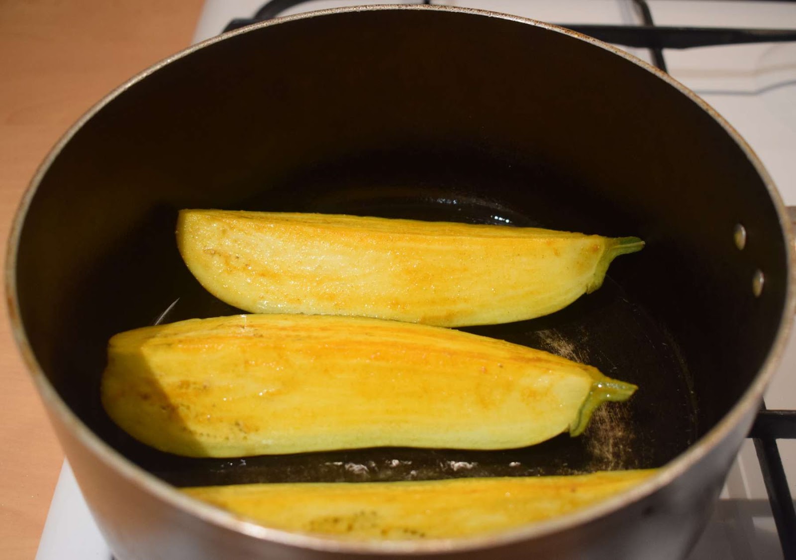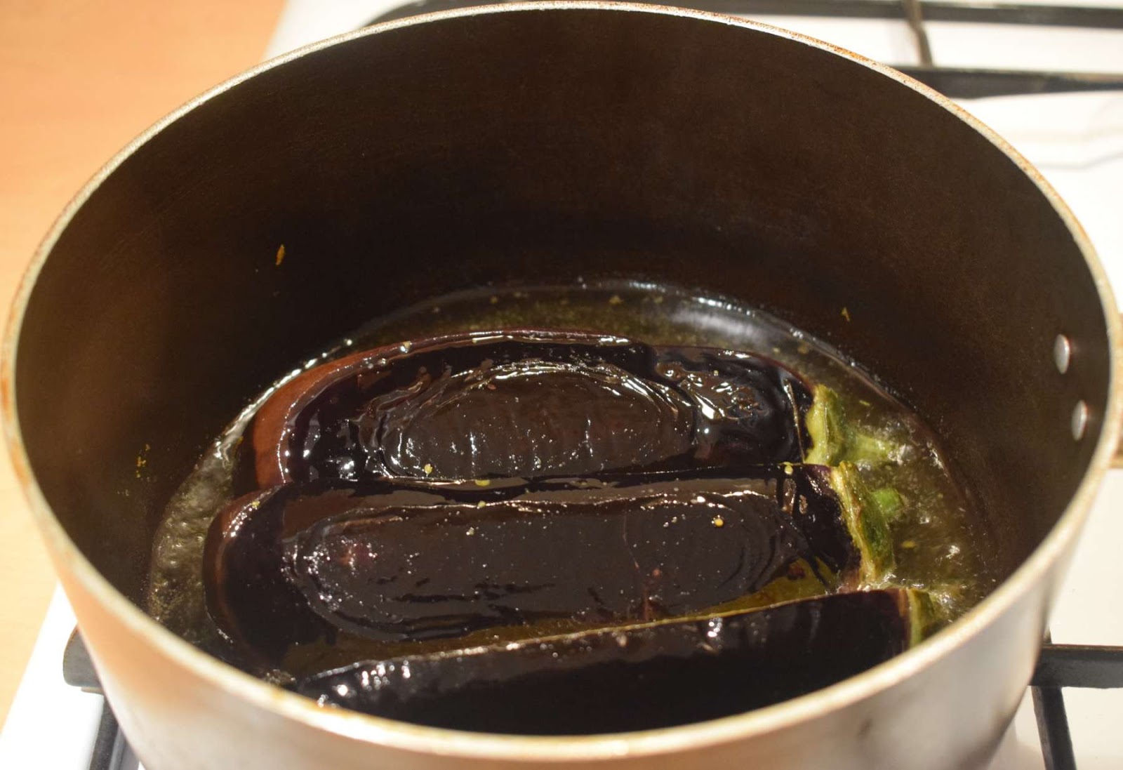 - Add Oil into the pan for shallow frying the marinated eggplant pieces.