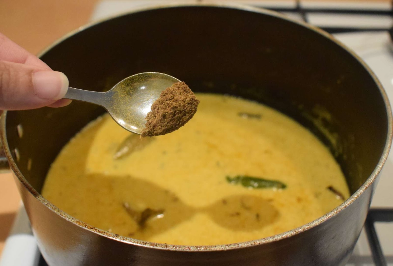 - Put the flame in low and add Bengali garam masala into the pan. Mix the masala nicely.