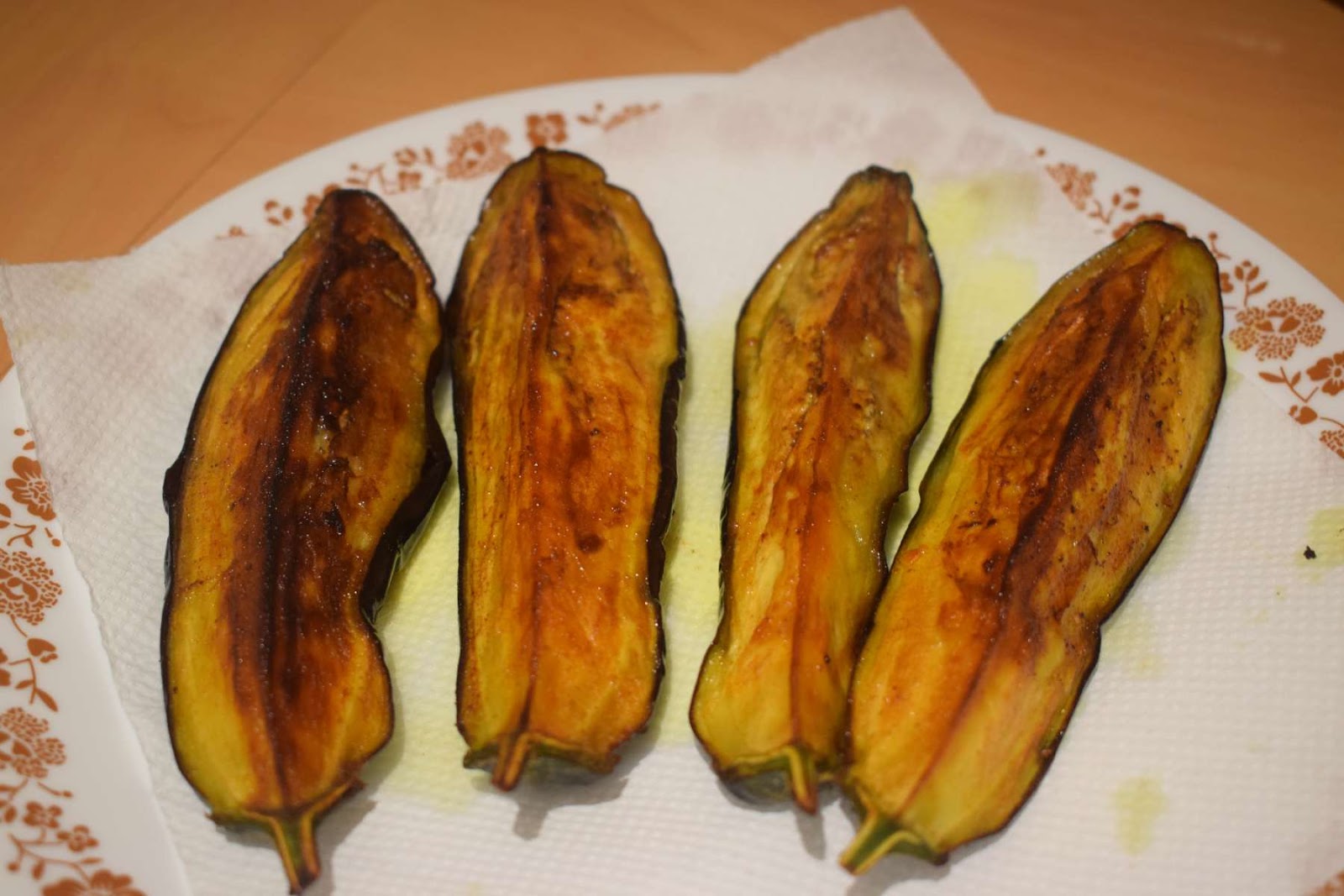 - Transfer the eggplant pieces on a plate lined with kitchen tissue. The kitchen tissue will absorb the excess oil.