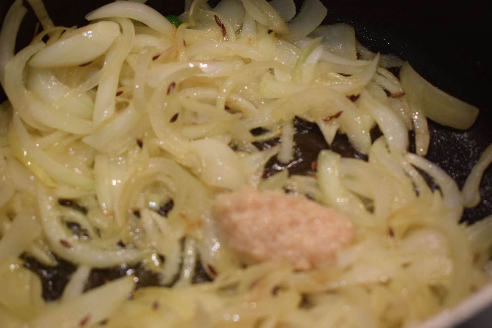 - Add Ginger-Garlic paste into the pan and cook it for another minute till the raw smell goes away.