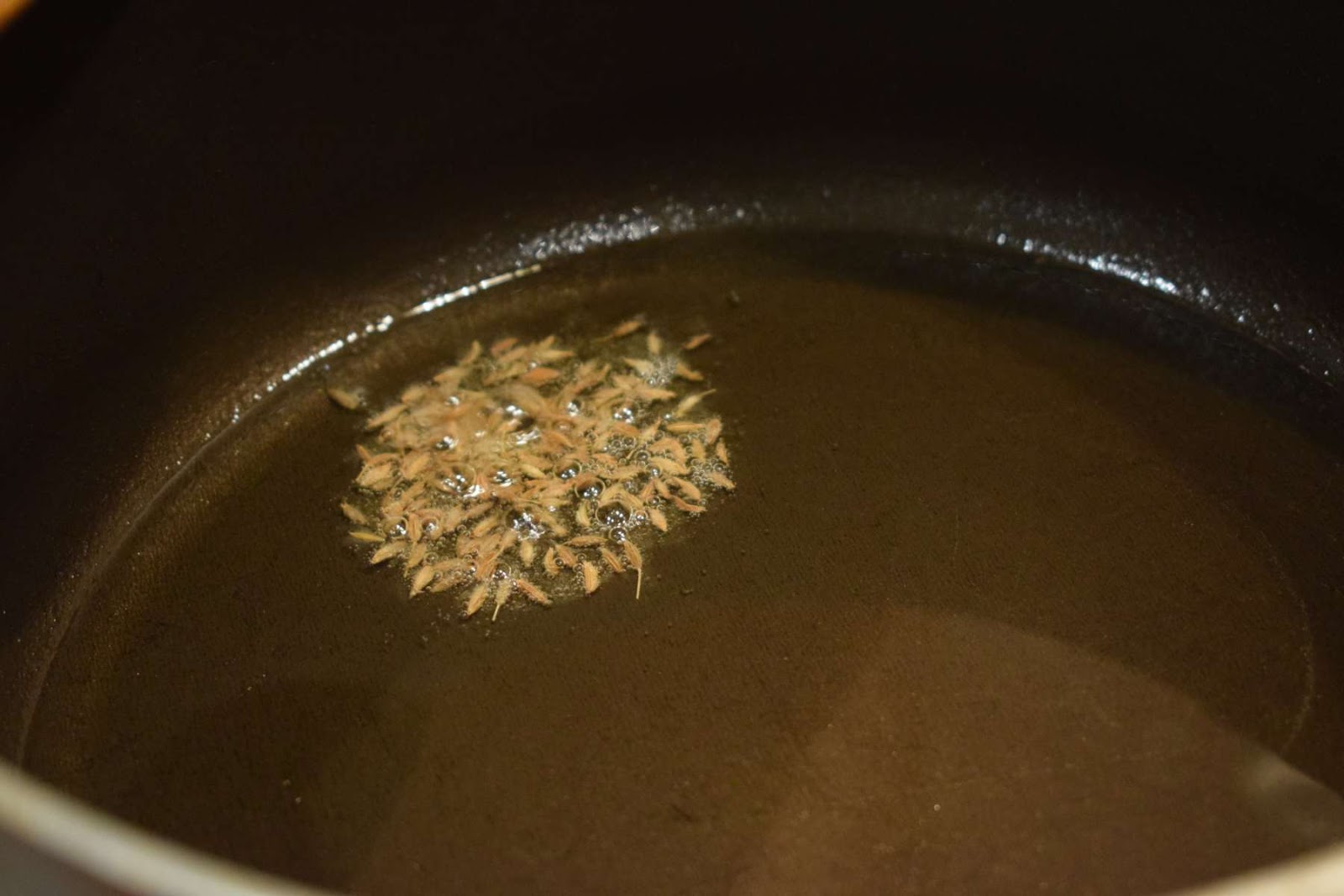 - Once the Oil is hot, add Cumin seeds and let them crackle.