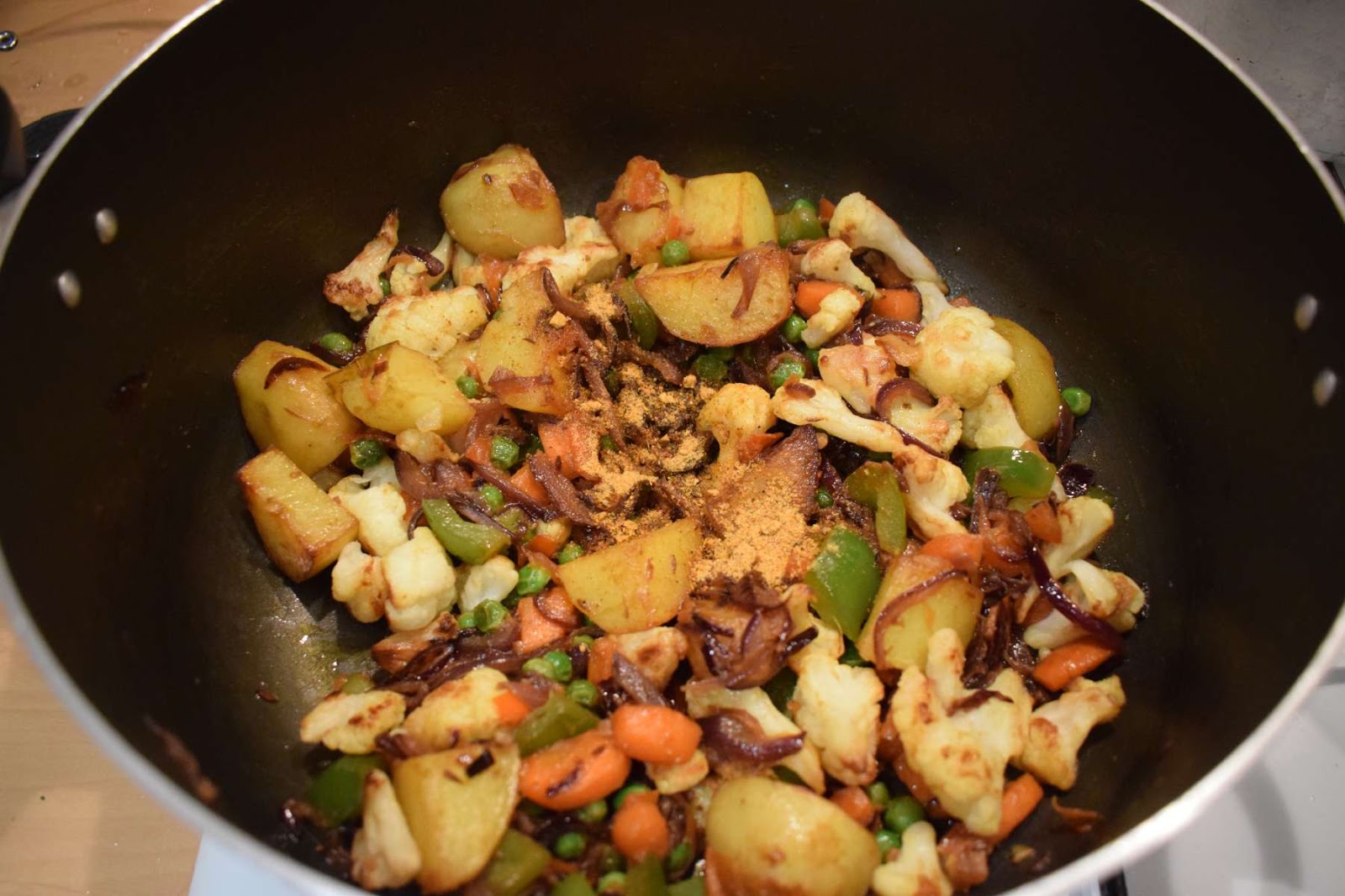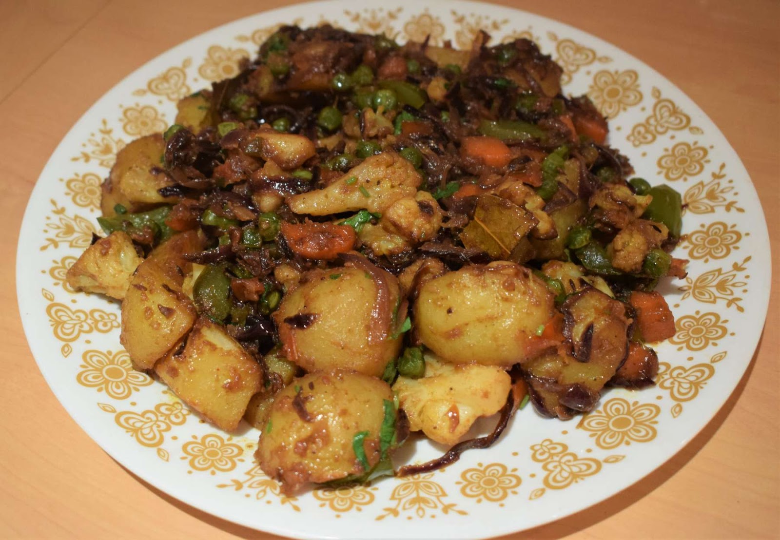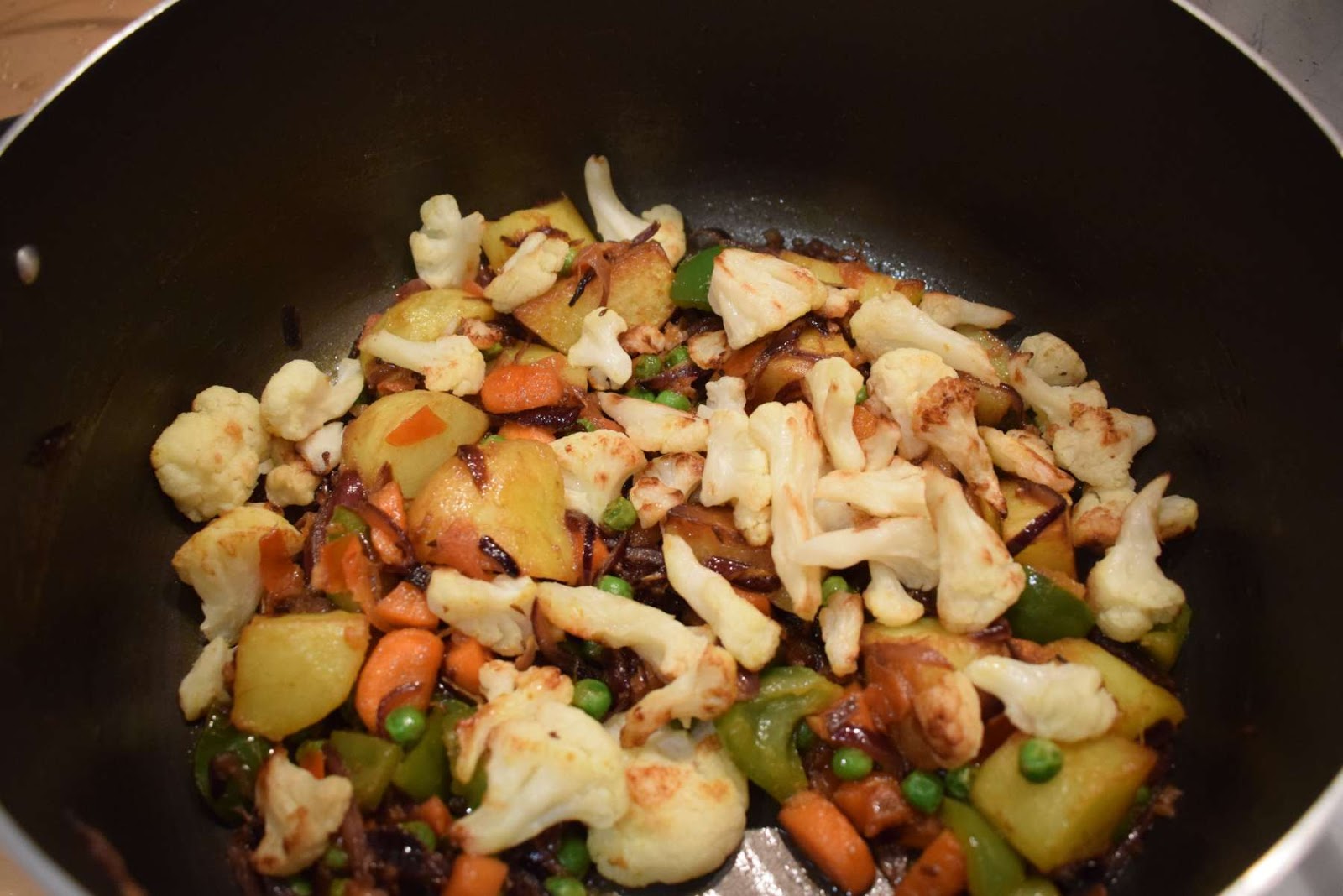 In this recipe, I have used few of my favourite vegetables. I have used Potatoes, Carrots, Bell Peppers, Cauliflower and Peas in this preparation. You can add some more vegetables or remove some of them as per your taste and preference.