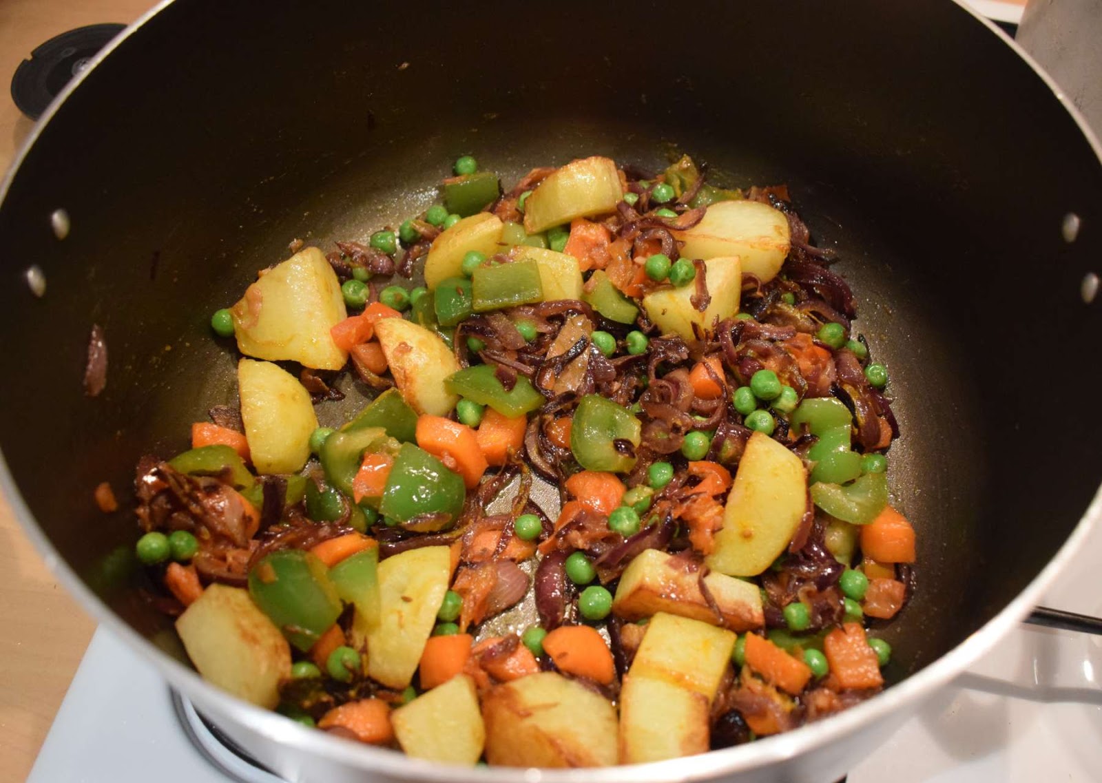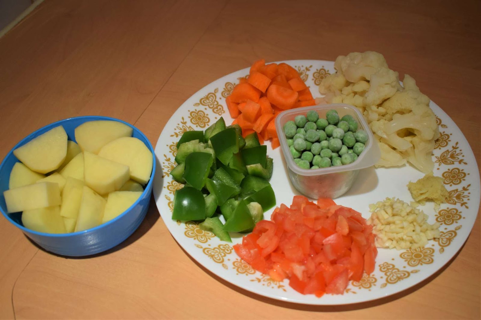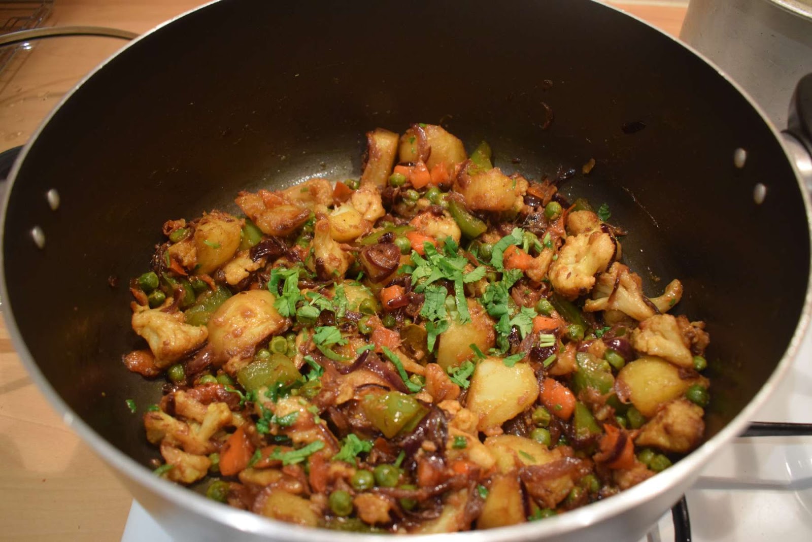 In this recipe, I have used few of my favourite vegetables. I have used Potatoes, Carrots, Bell Peppers, Cauliflower and Peas in this preparation. You can add some more vegetables or remove some of them as per your taste and preference.