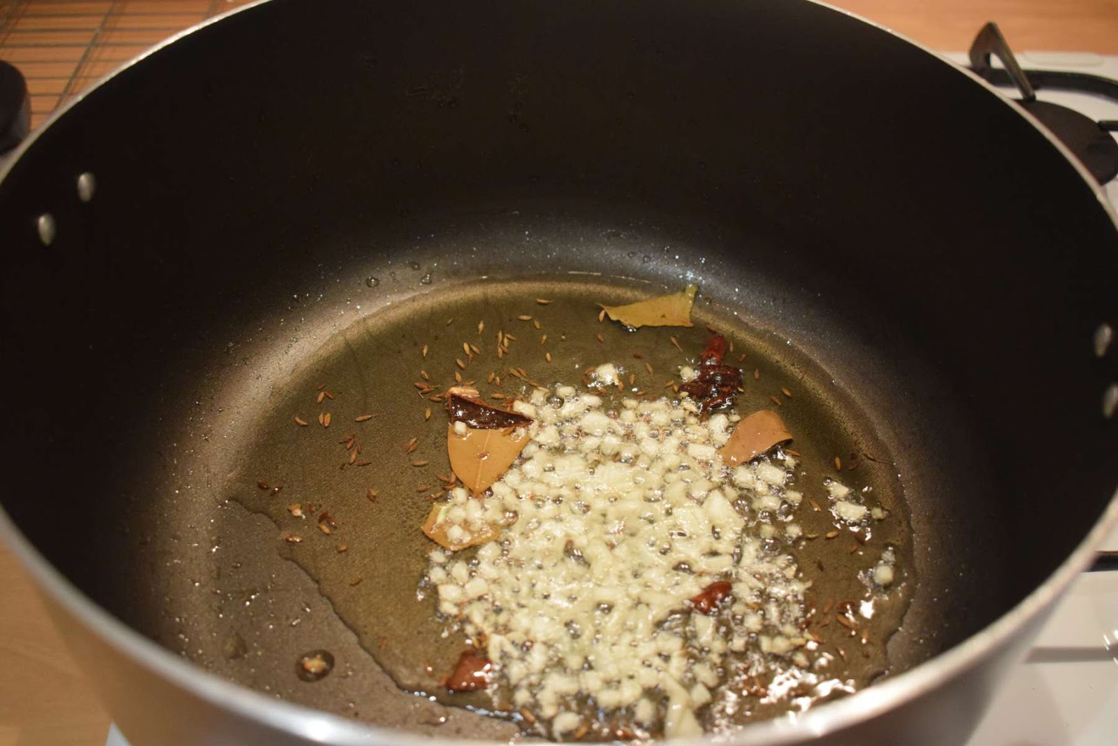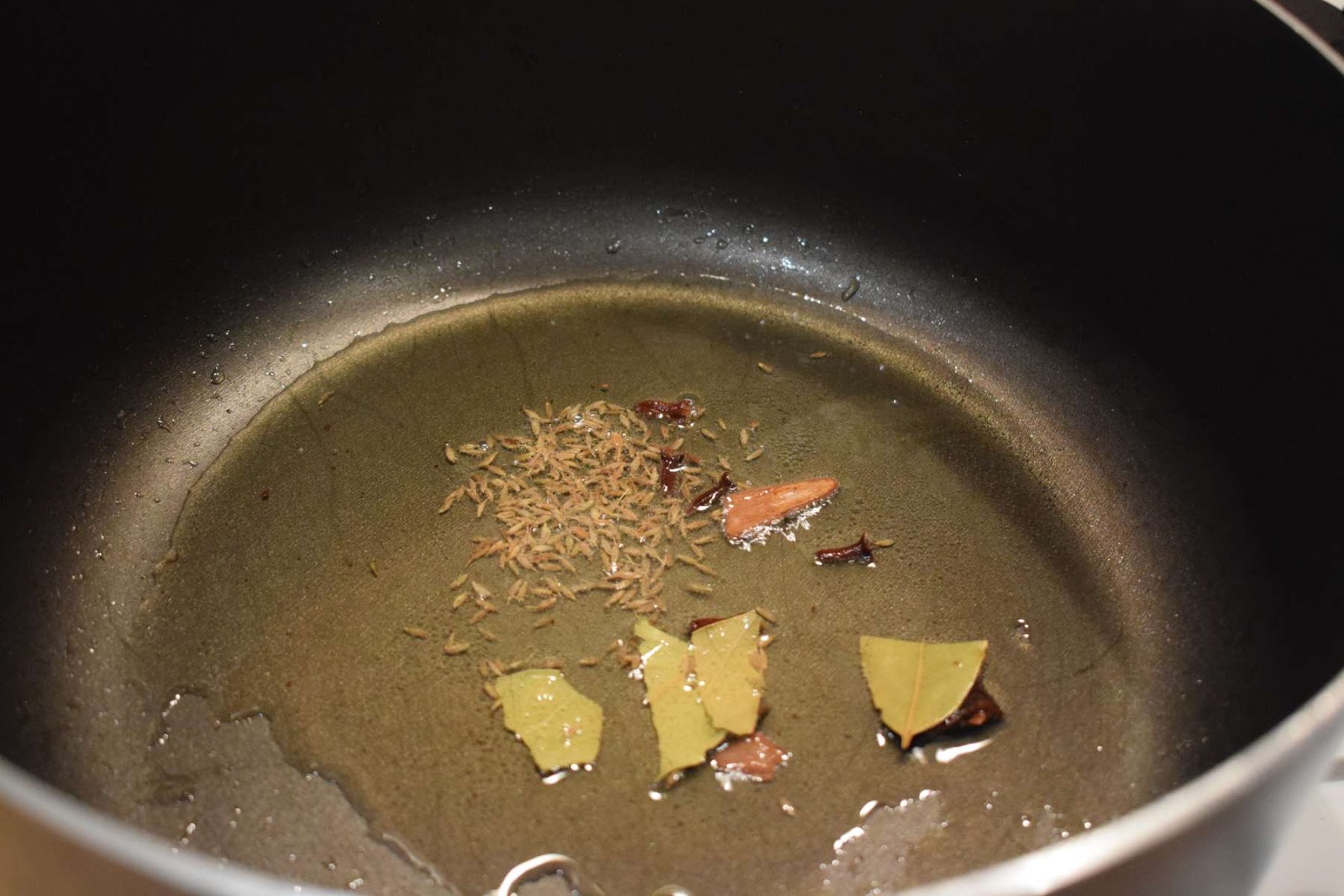 - Once the oil is hot, add Cumin seeds (Jeera), Bay leaves (Tejpatta), Cinnamon sticks (Dalchini), Cloves (Lavang) and allow them to crackle.