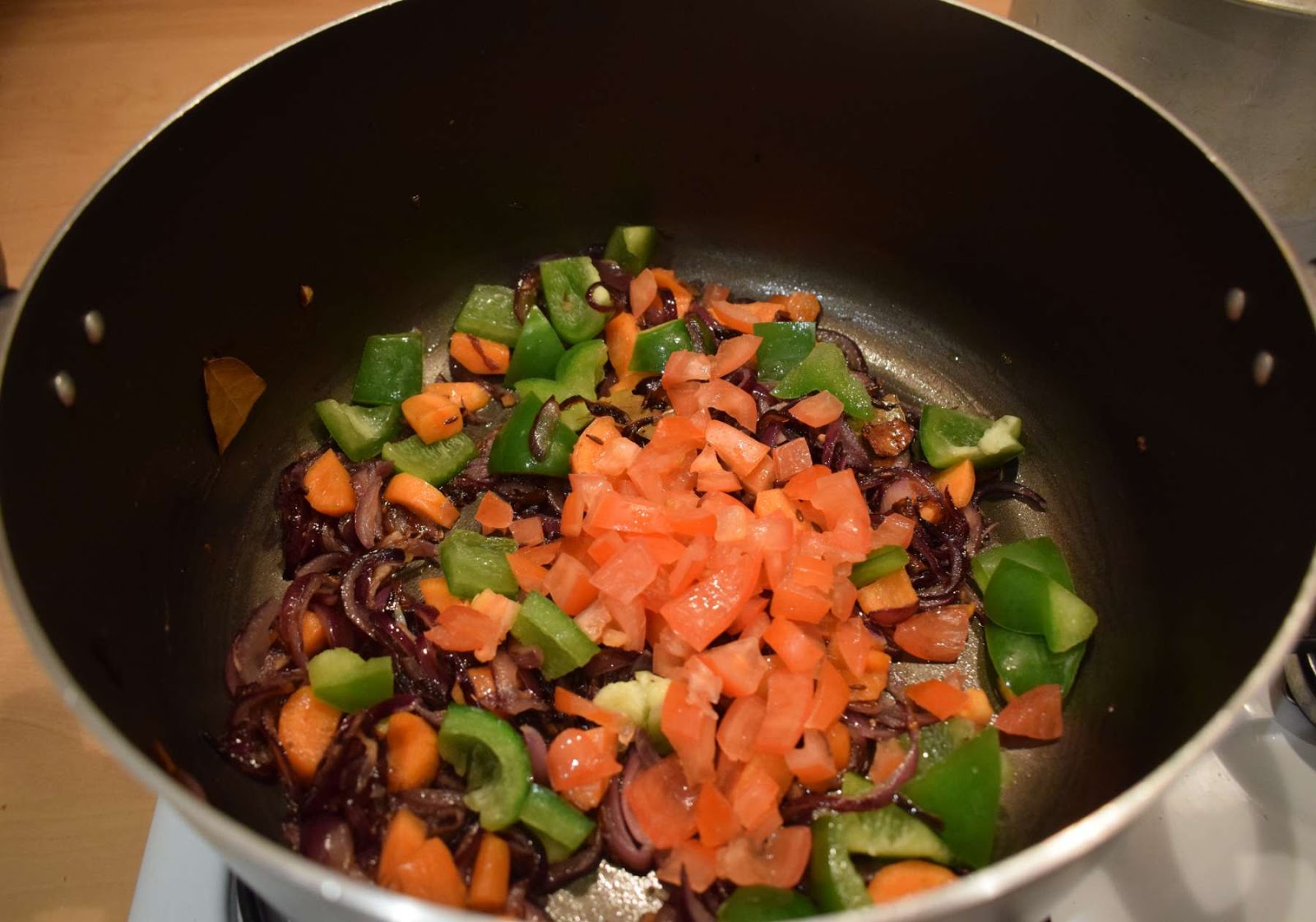 - Add green Bell Pepper, green Chillies and Tomatoes and stir well.