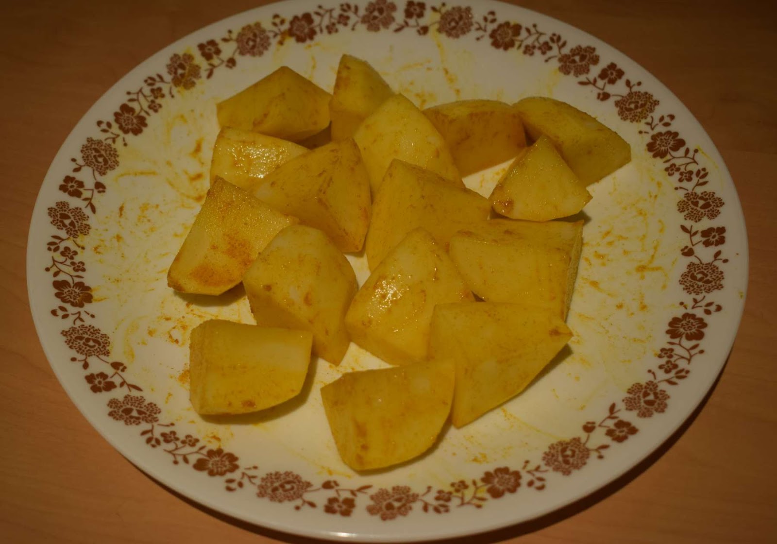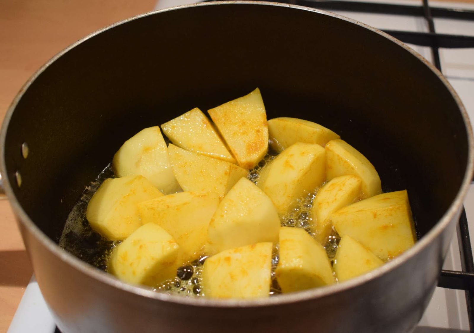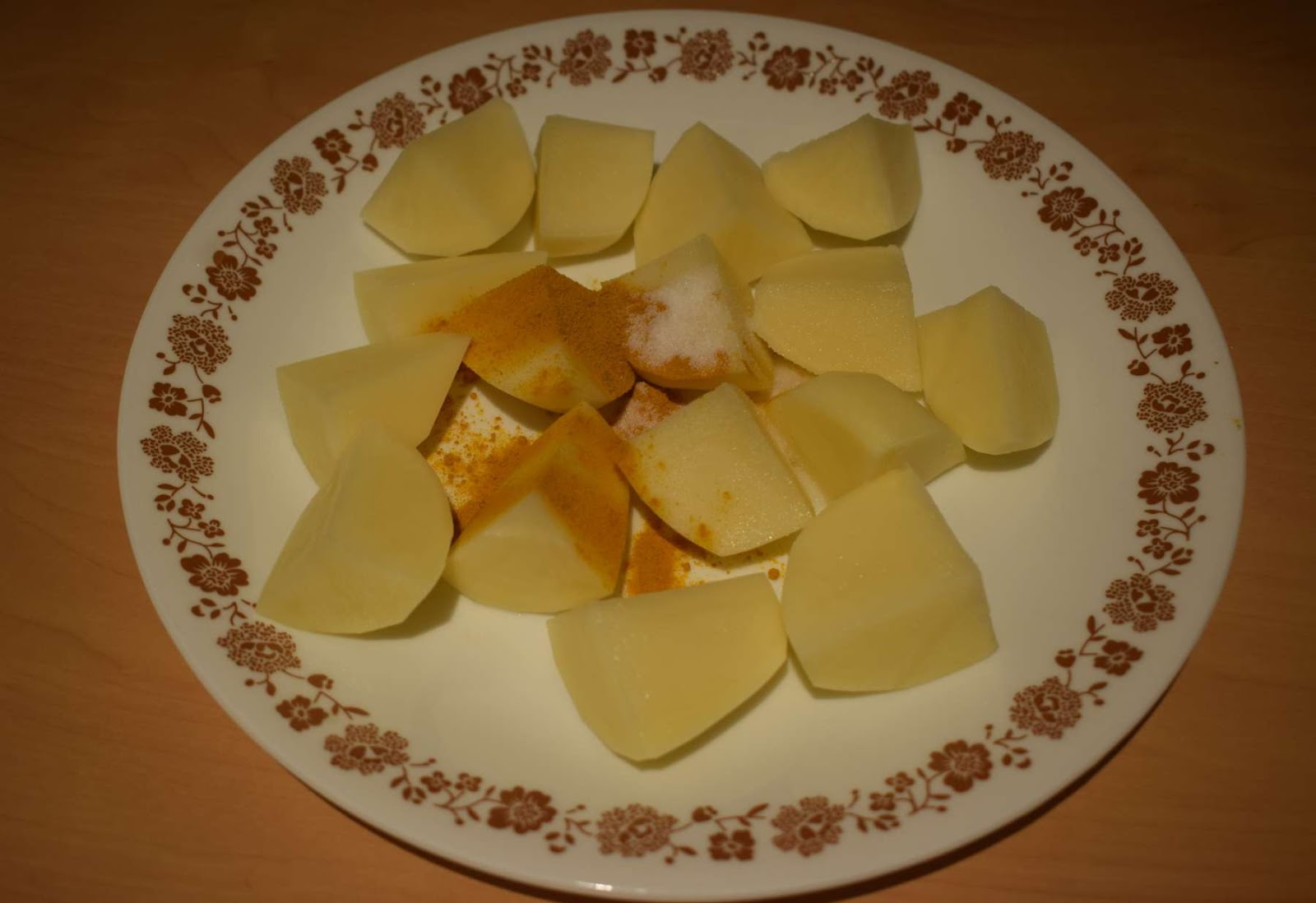 - On the other hand, marinate the potato chunks with salt and turmeric powder.
