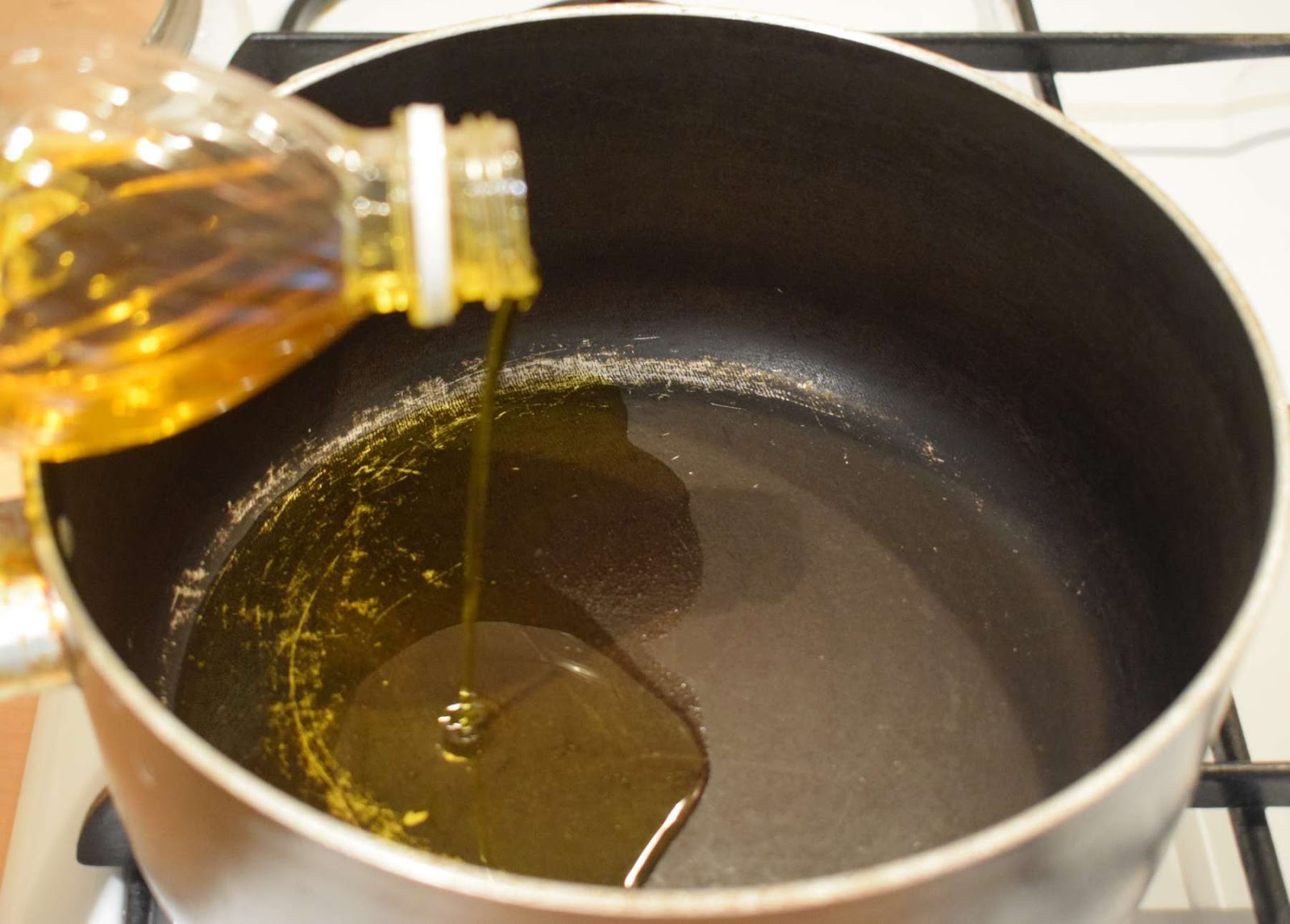 - Add Mustard oil into the pan and wait until the oil is hot.