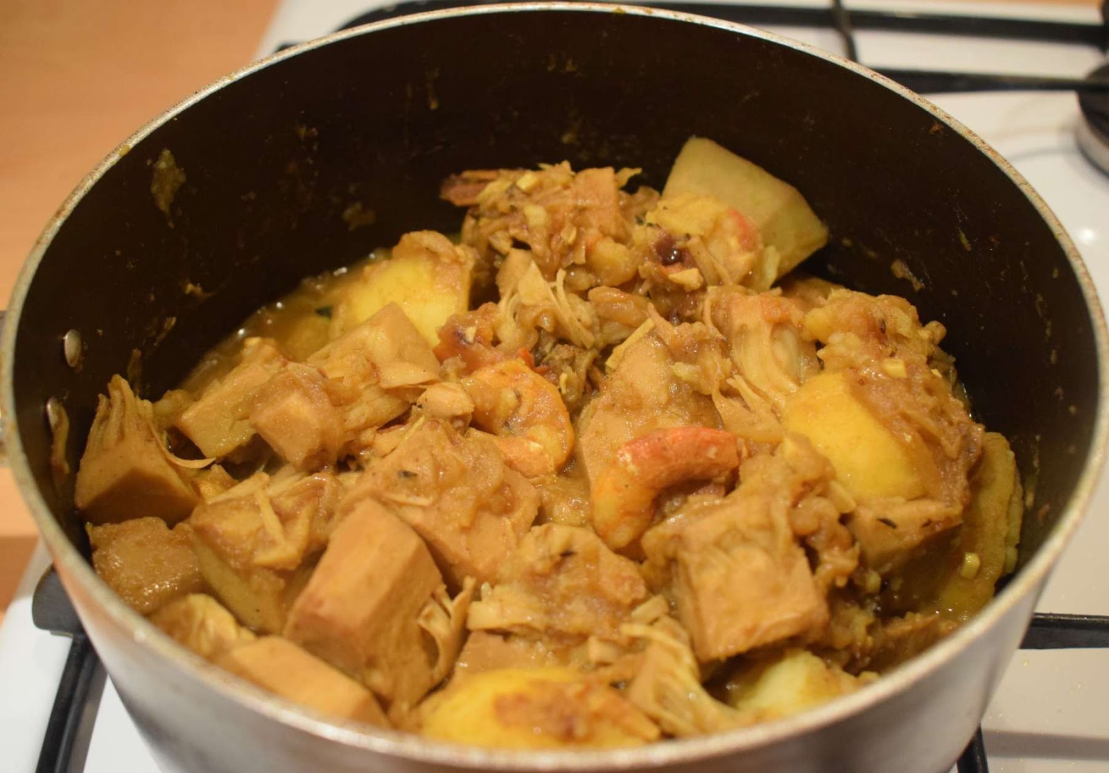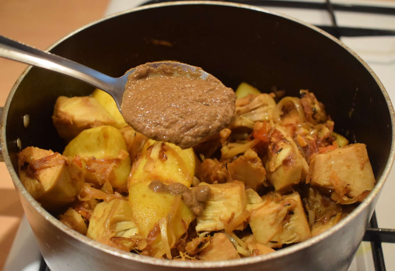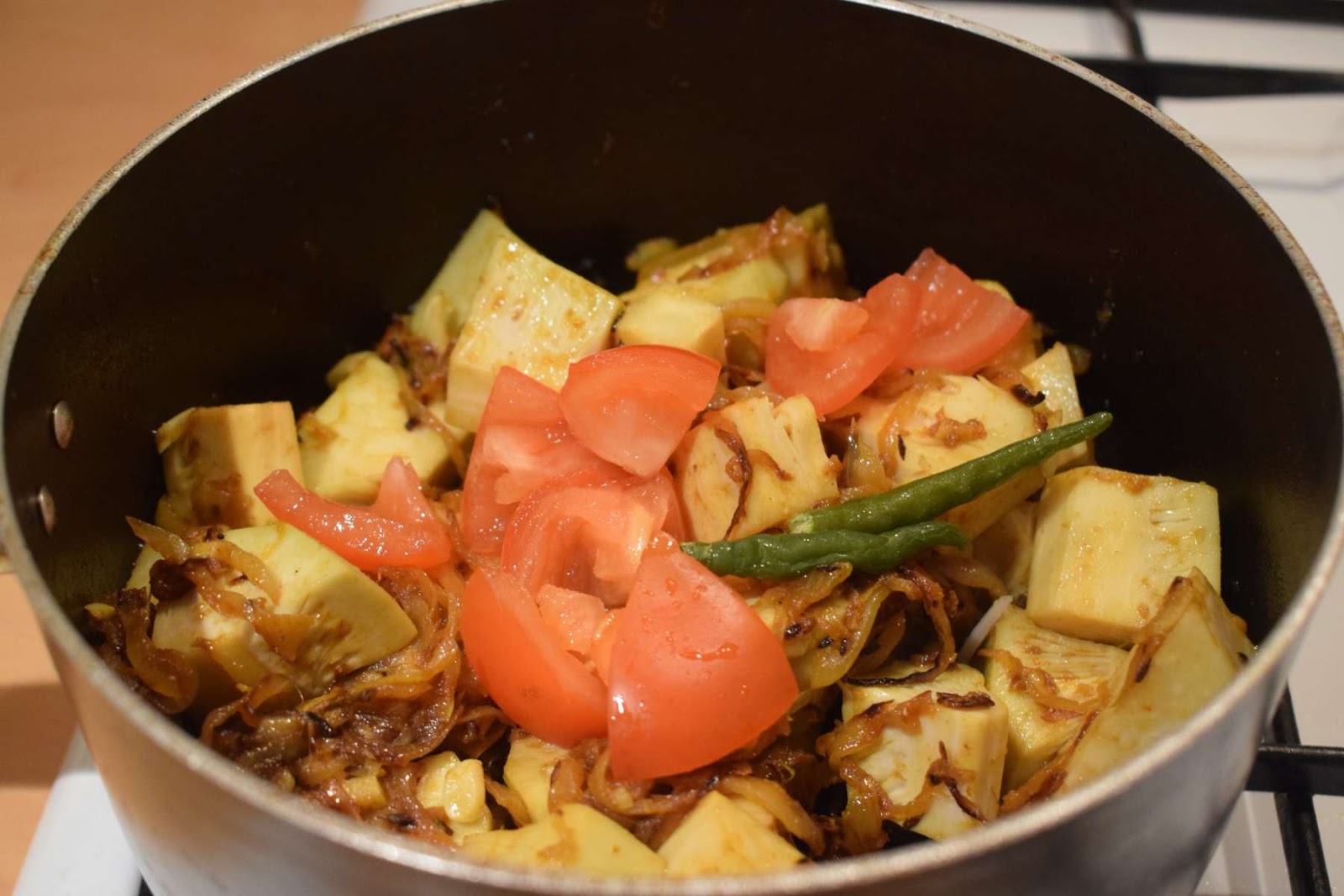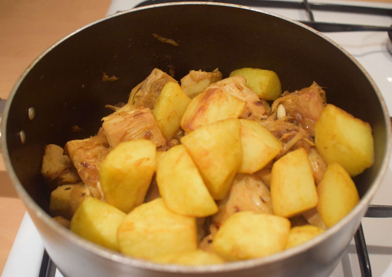 - Cover the pan and cook it for another 3-4 minutes until the tomatoes and jackfruit pieces get tender.