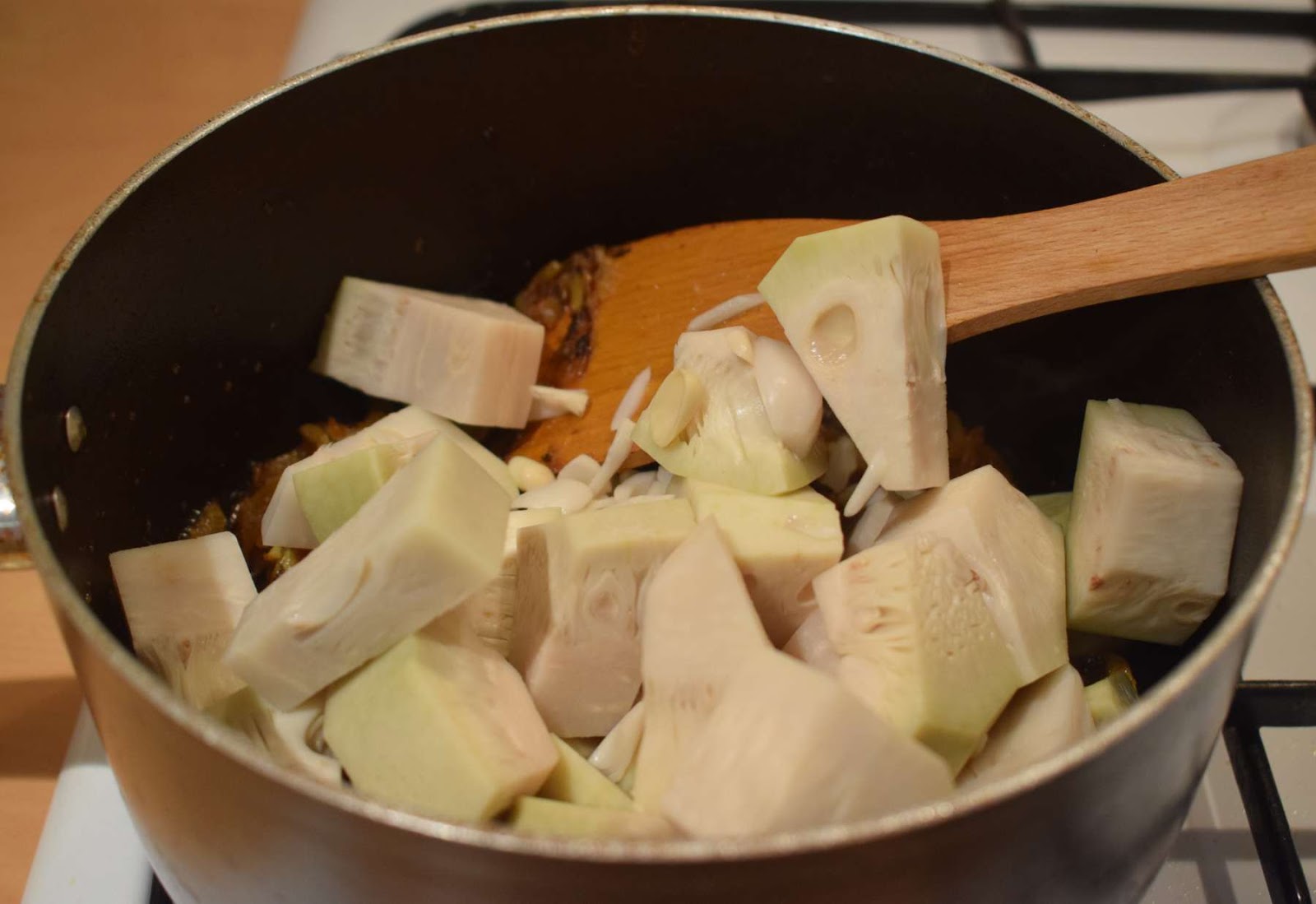 - Add the raw jackfruit pieces (Step 5) into the pan and evenly coat it with the masala.