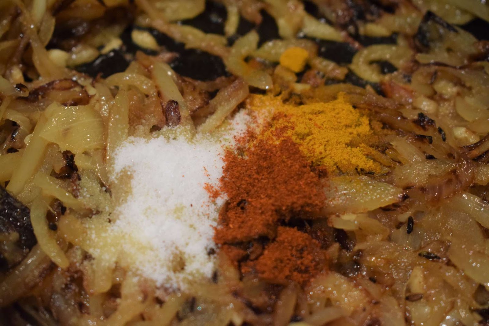 - Add salt, turmeric powder, red chilli powder and give a nice mix.