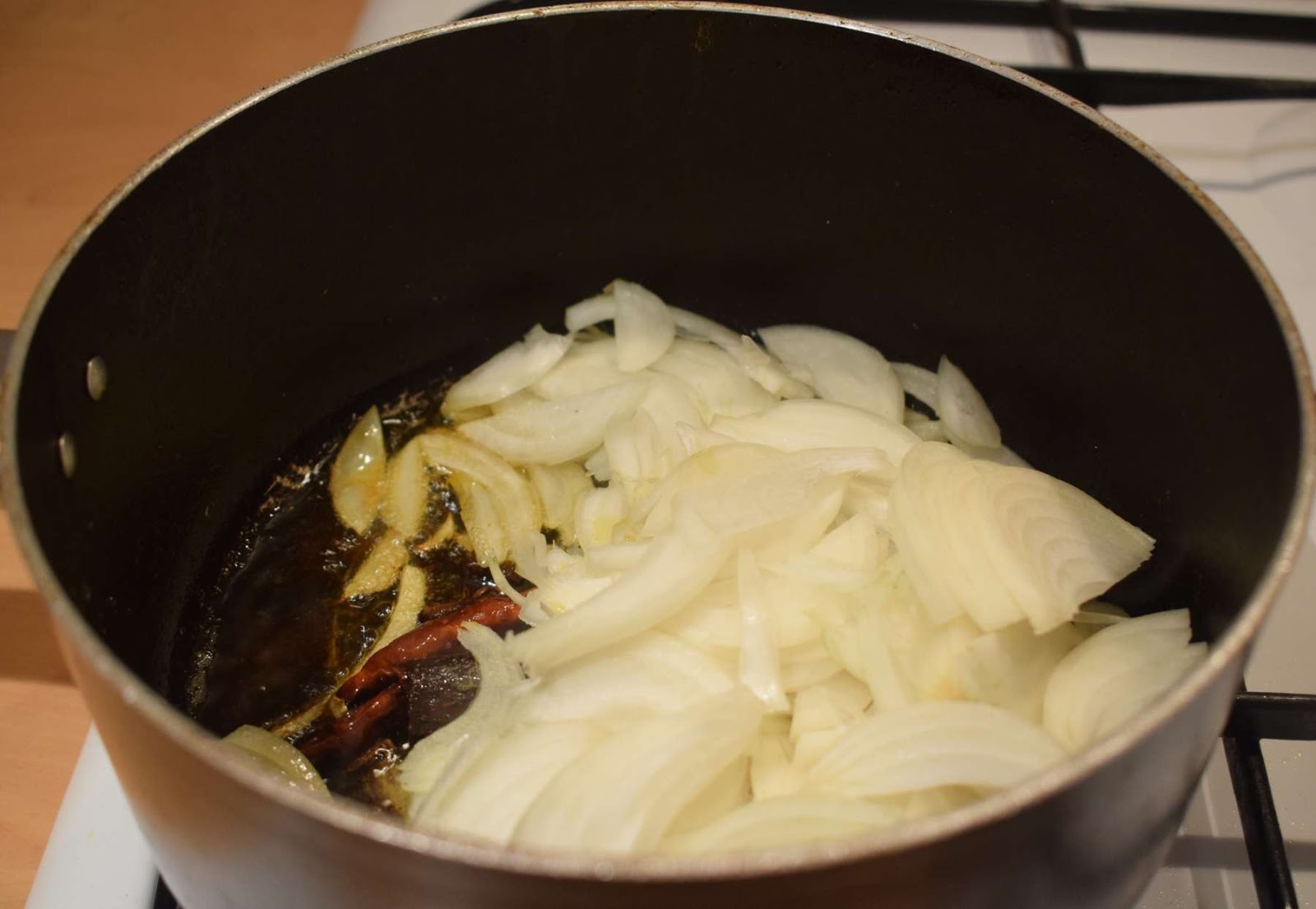 - Add onion slices into the pan and cook it in medium flame for 5-6 minutes until the onion become translucent. Stir in between.