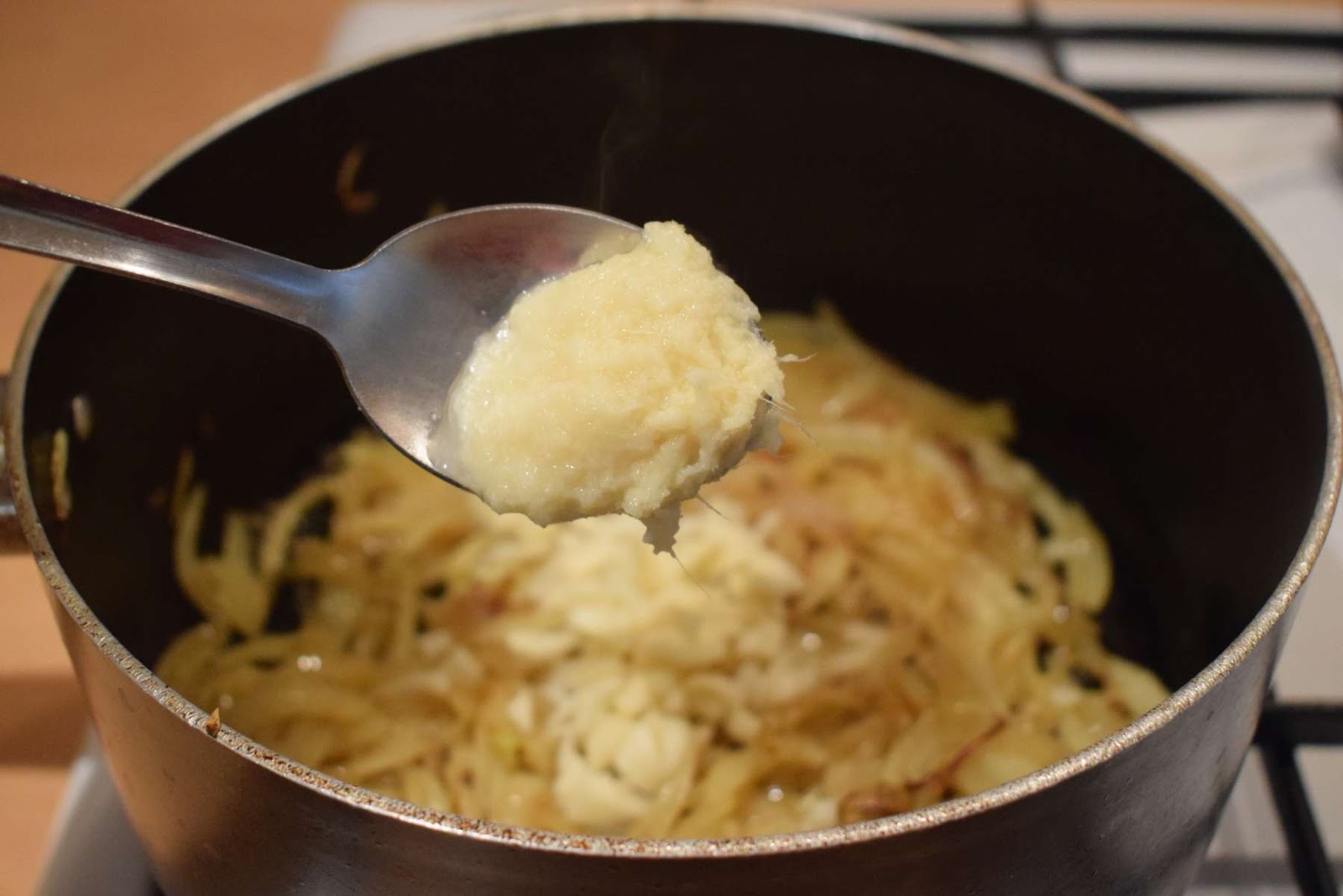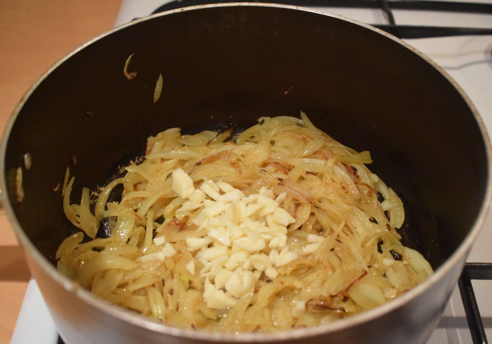 - Add garlic and cook it in medium flame for couple of minutes until the raw smell goes away.