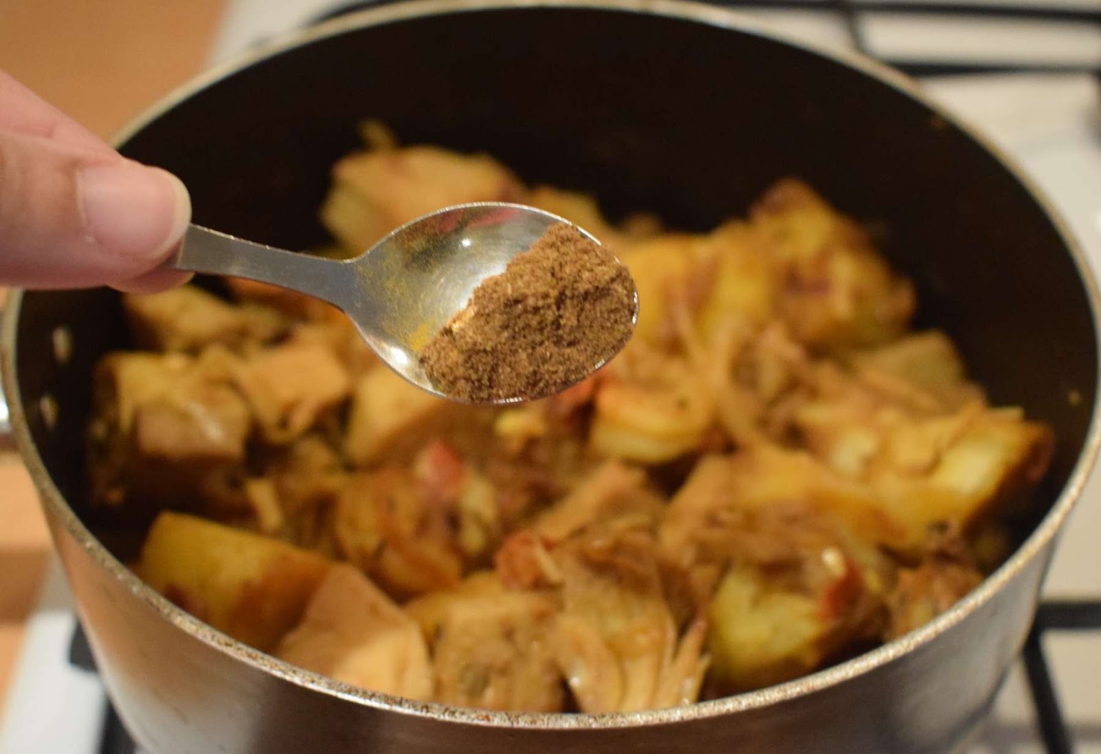 Then added the tomatoes, fried potato chunks, spices one by one and cooked the jackfruit with it. I have used cumin powder, coriander powder, red chilli powder and Bengali garam masala powder (a ground spice mixture which contains equal portion of cardamom, cinnamon and cloves) for the recipe. These spices complement the flavour of the dish very well.