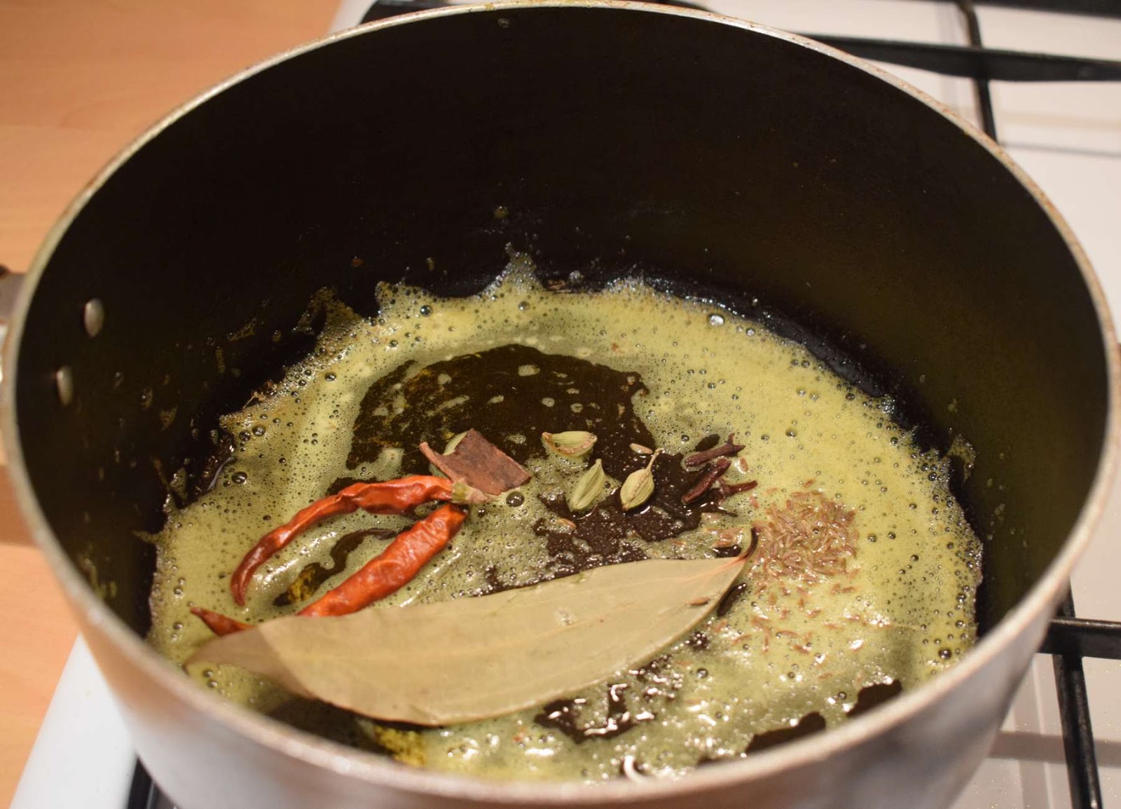 - Add bay leaf, cloves, cardamom, cinnamon stick, cumin seeds and dry red chillies into the pan and let them crackle.