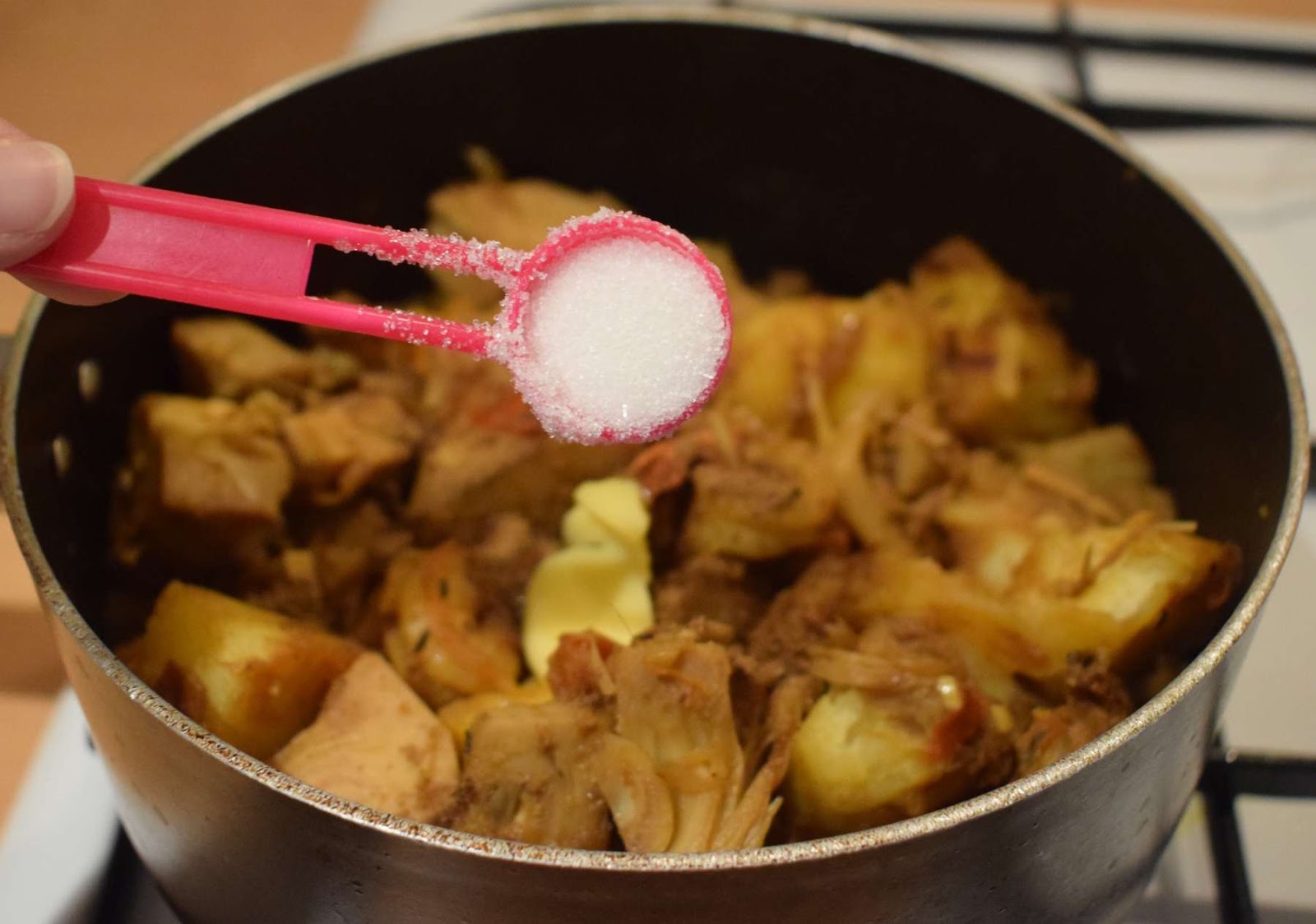 - Add Bengali garam masala powder, sugar and ghee into the pan and mix it properly.