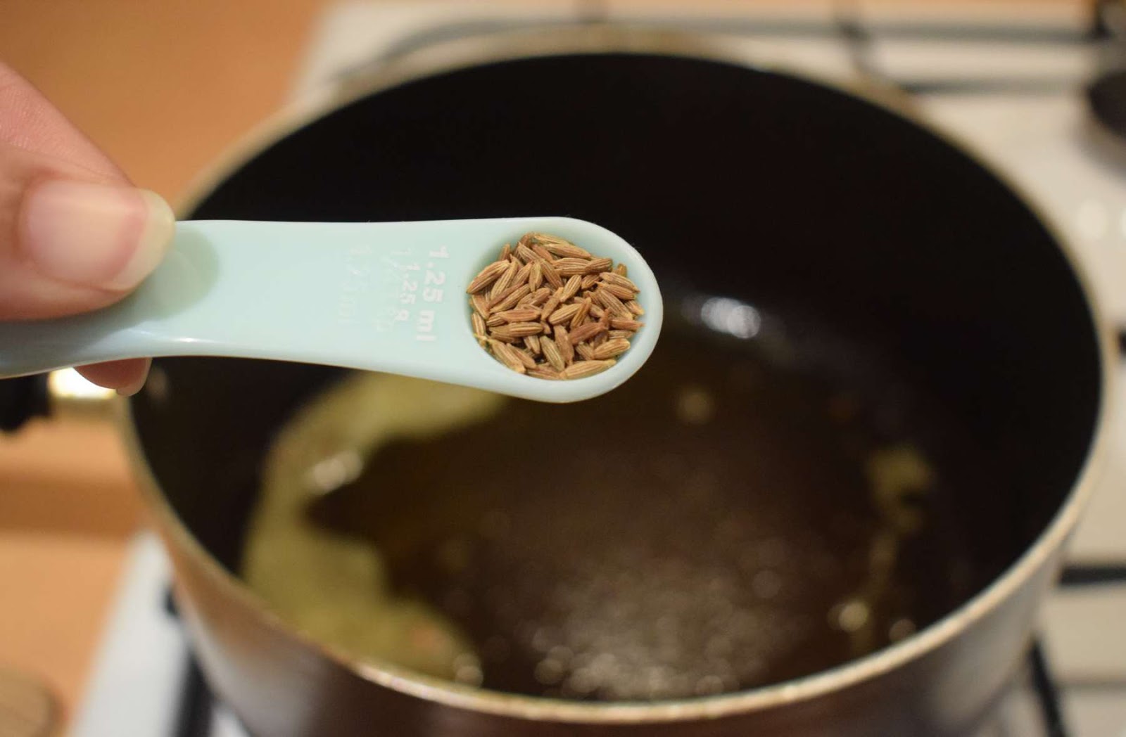 - Once the oil is hot, add Cumin seeds and let them crackle.