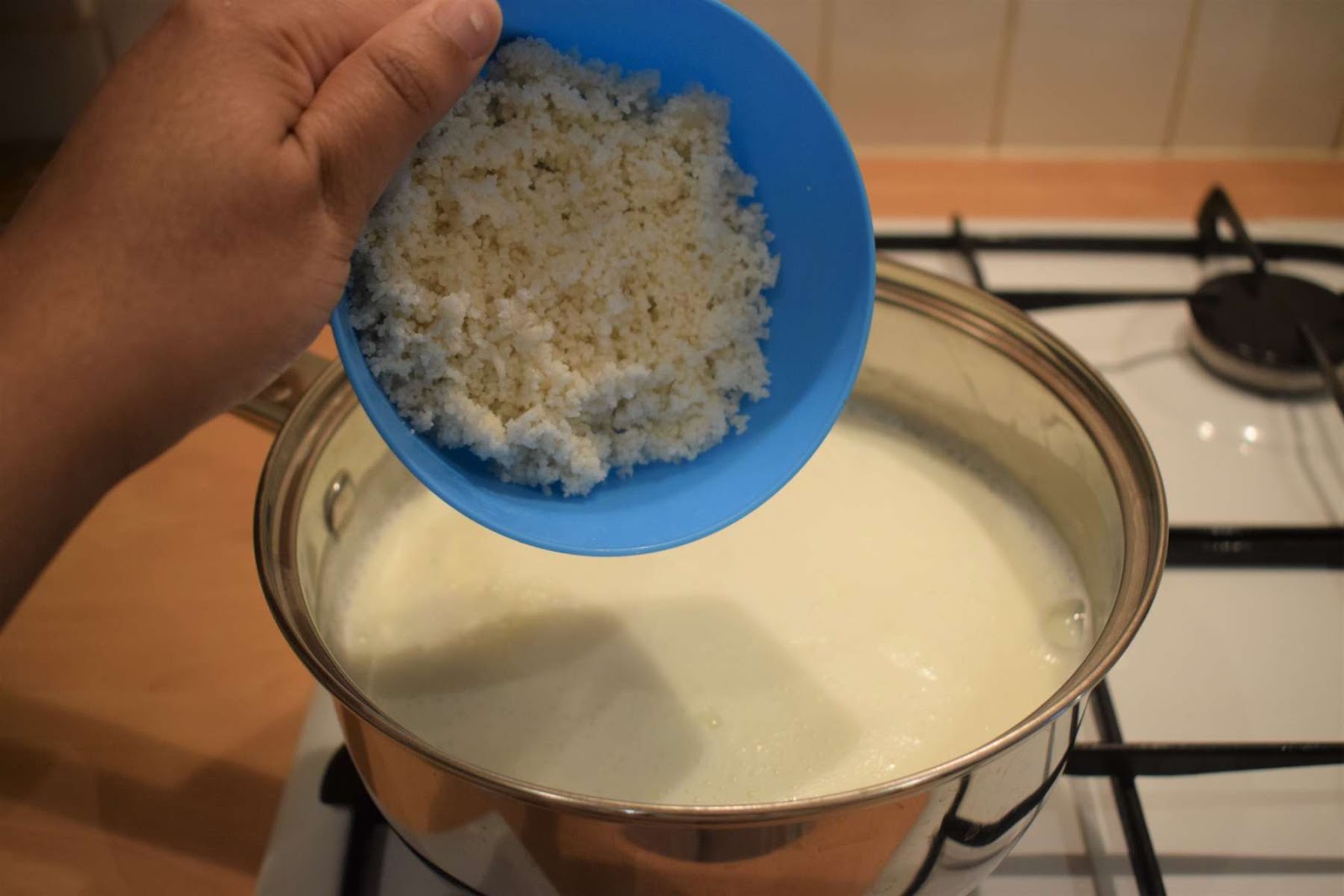 - During the time of cooking the coarsely ground Rice, stir the milk repeatedly in small intervals of time.