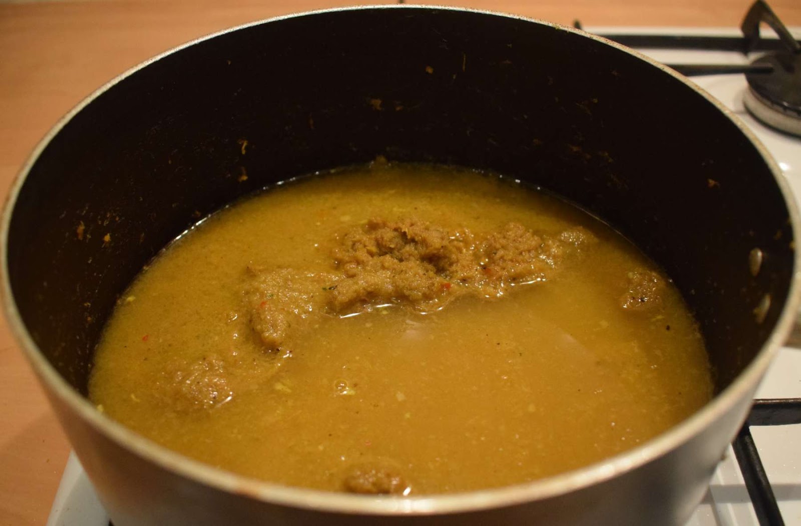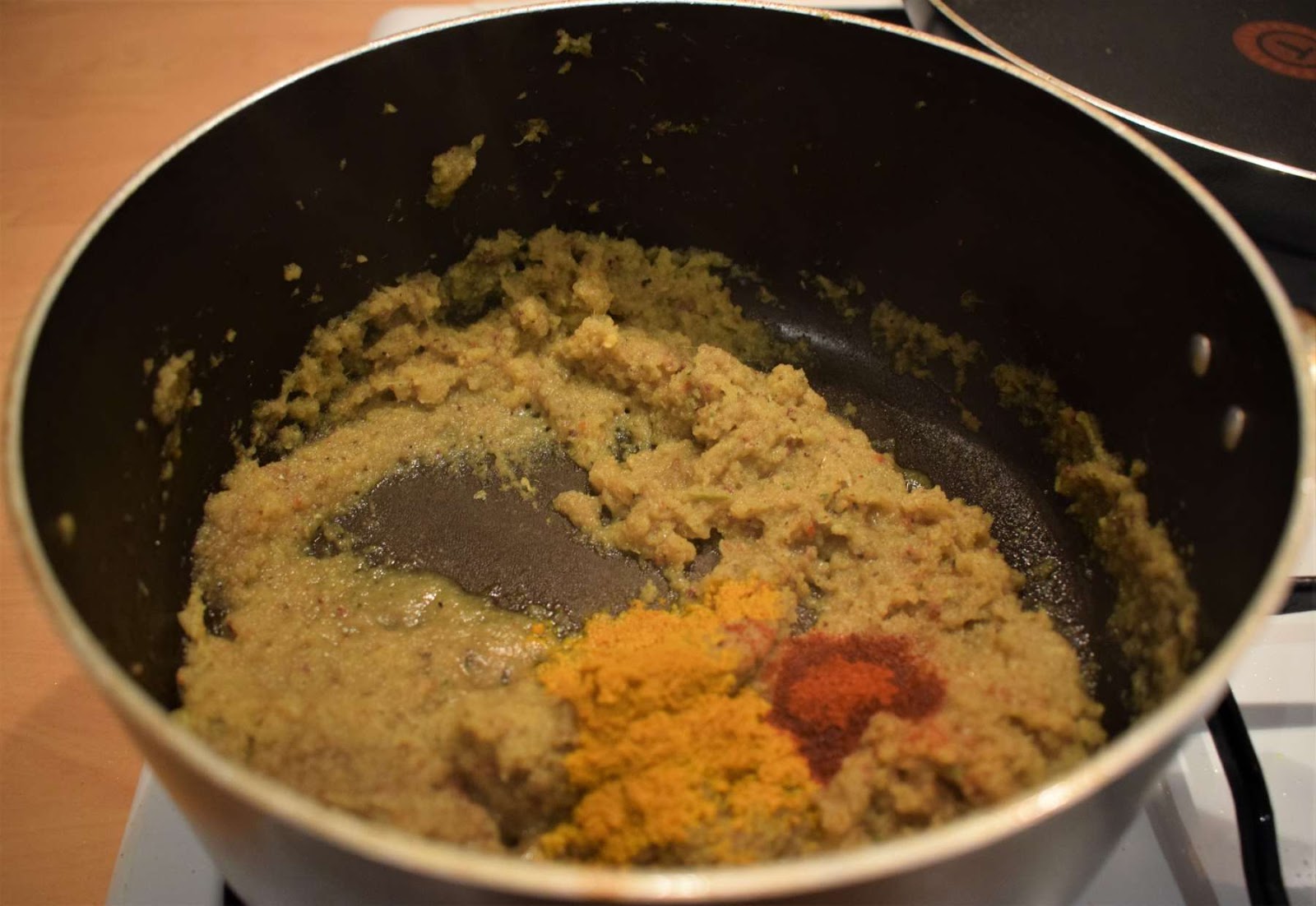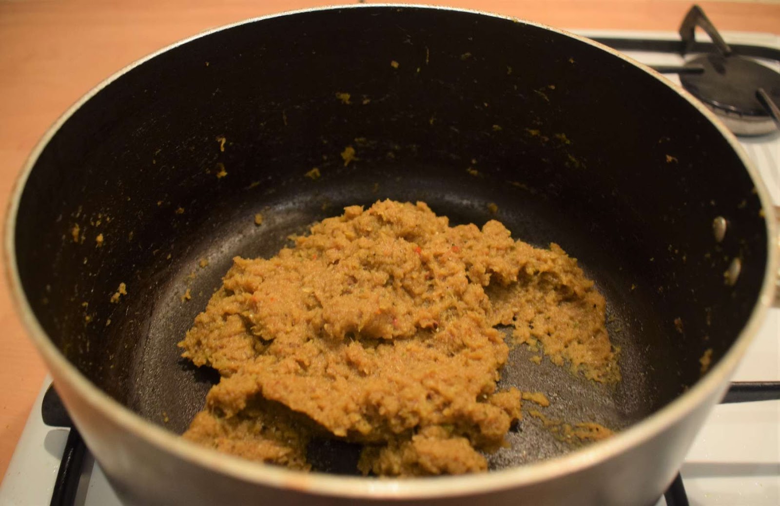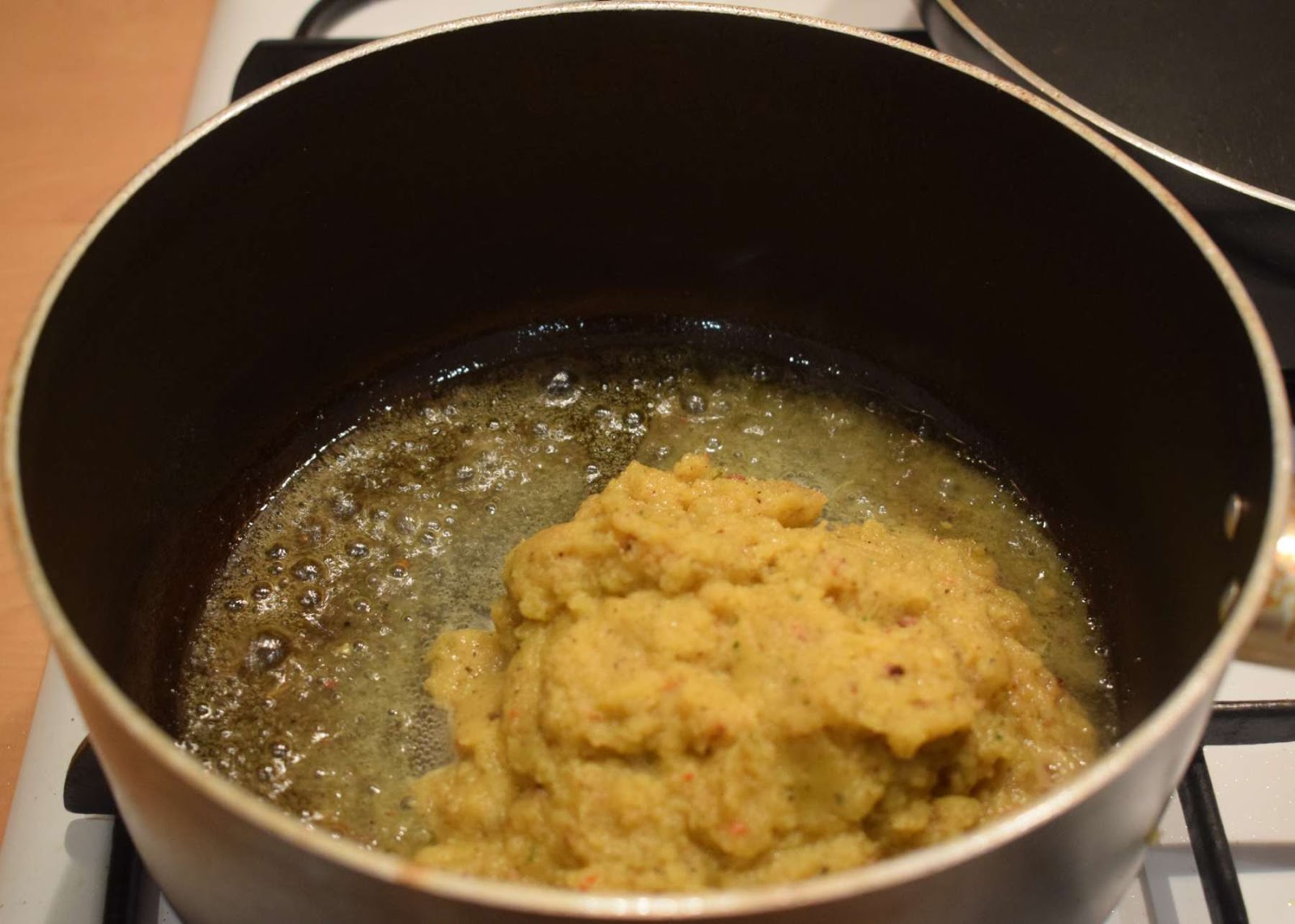 - Once the oil is hot, put the flame in low and add the masala paste (Step 6) into the pan.
