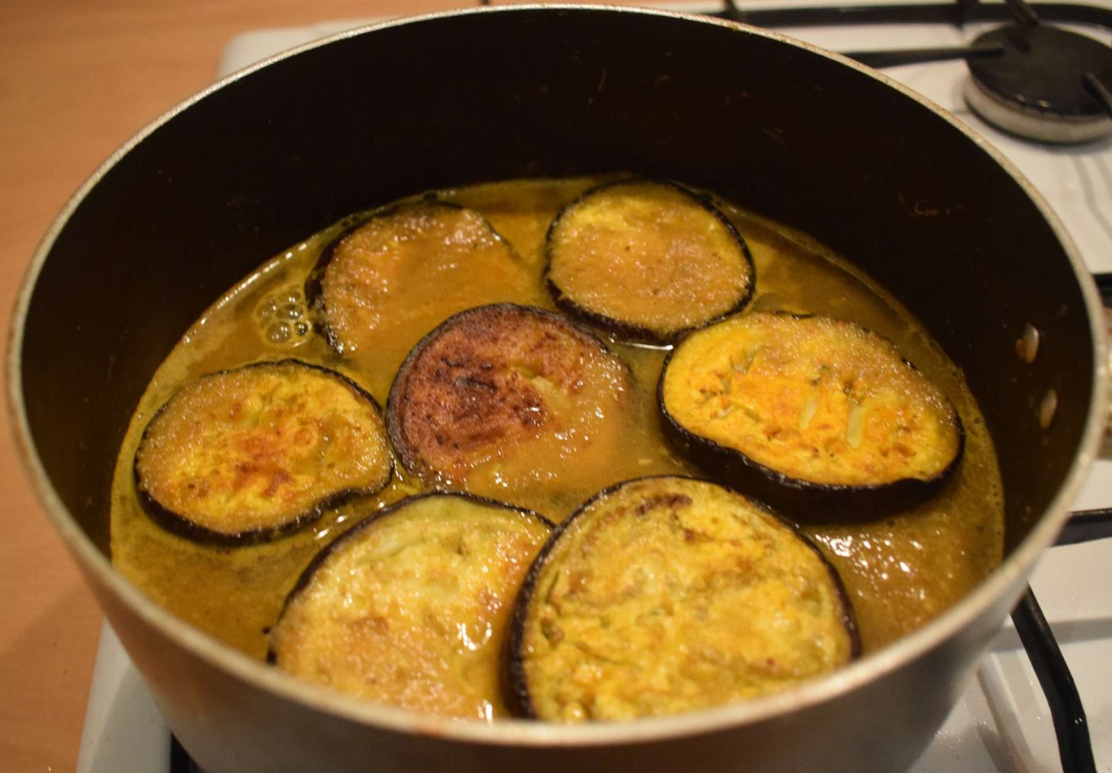 - Put the flame in low and add the shallow fried Aubergine slices (Step 11) into the gravy.