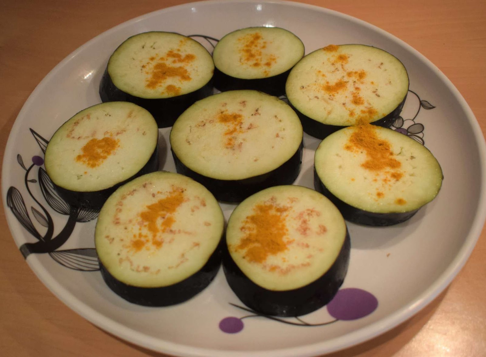 - Sprinkle Salt and Turmeric powder on the Aubergine slices.