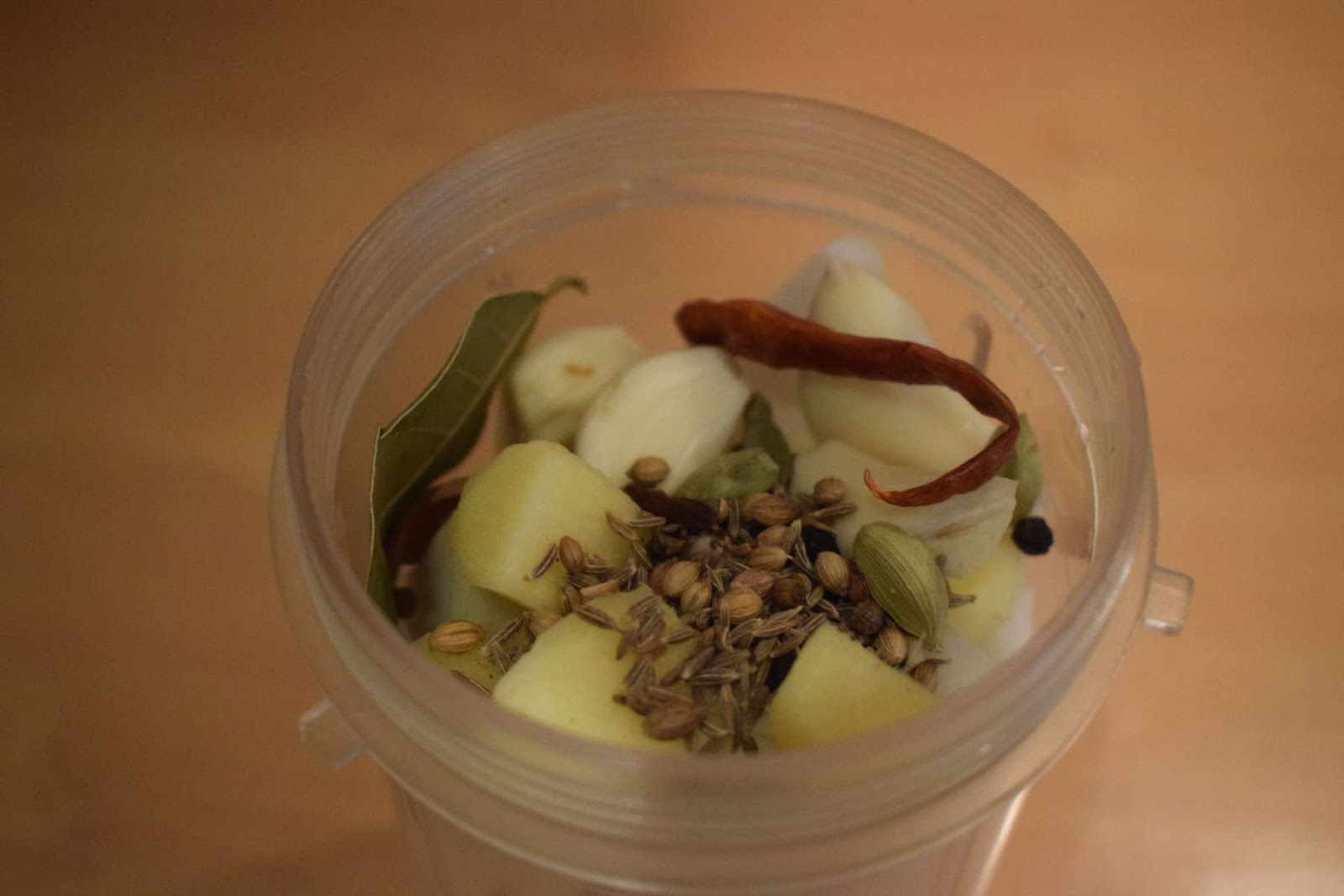 - On the other hand, add Onions, Ginger, Garlic cloves, Bay leaves, Cumin seeds, Cardamoms, Cinnamon stick, Cloves, Coriander seeds, dry Red Chillies and whole Black Peppers into the jar of a grinder or blender.