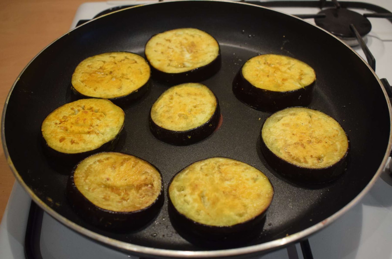 - Add Oil into a large pan for shallow frying the marinated Aubergine slices.