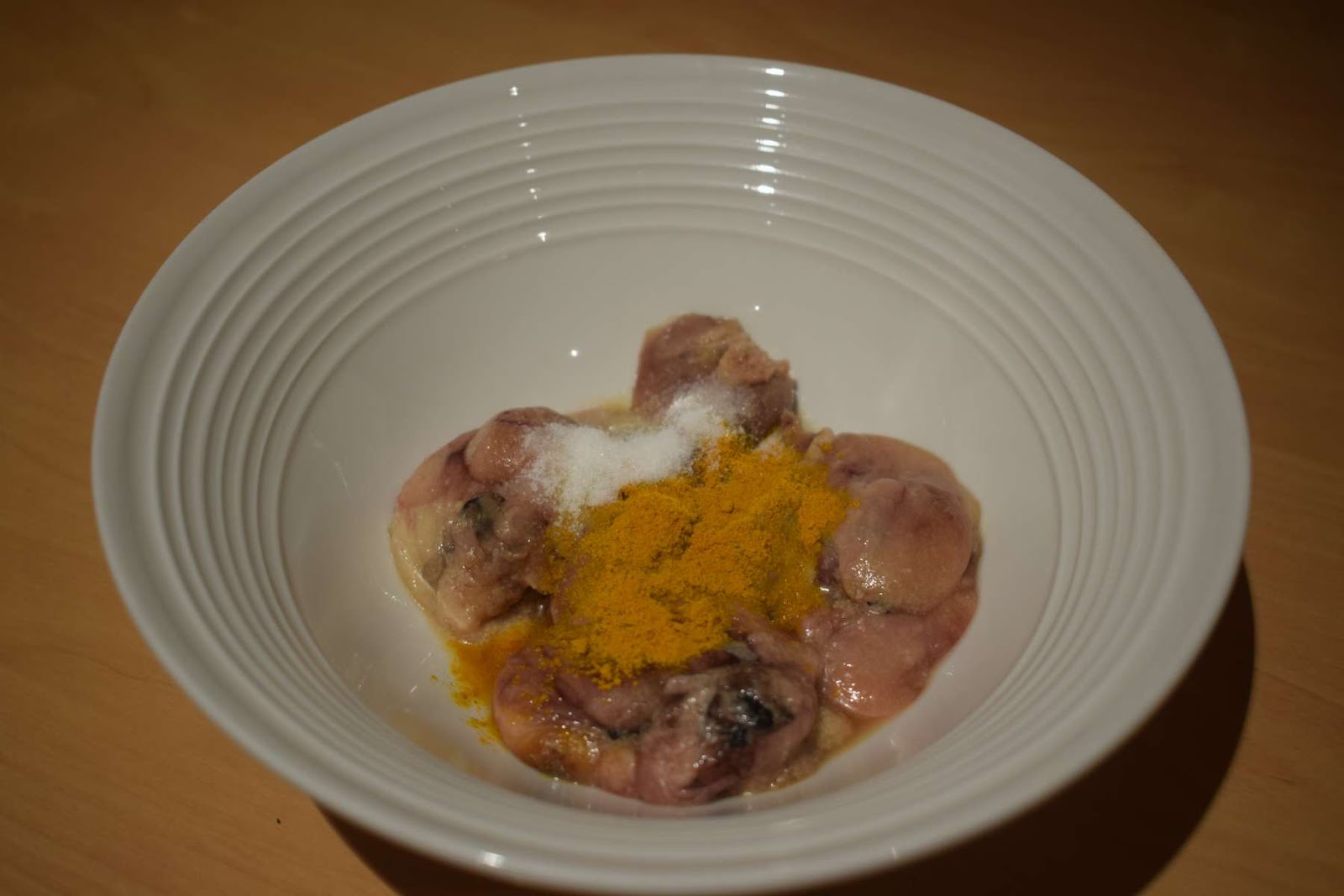- On the other hand, marinate the fish roe with Salt, Turmeric powder in a bowl and keep it aside.