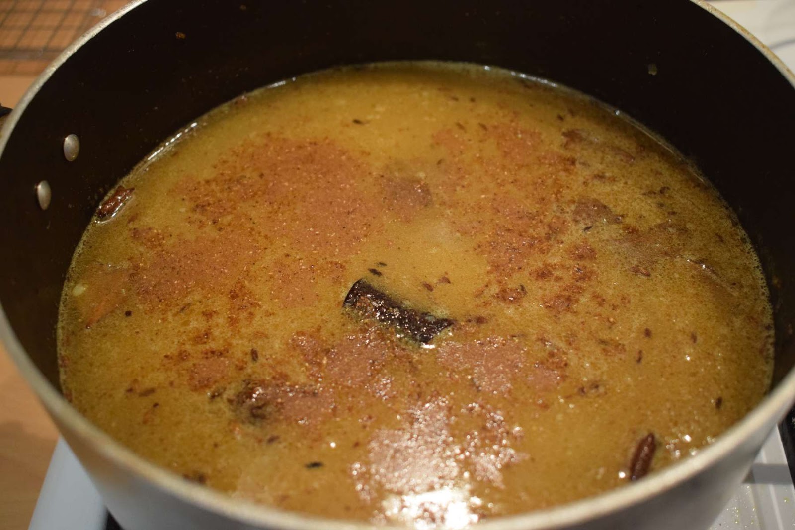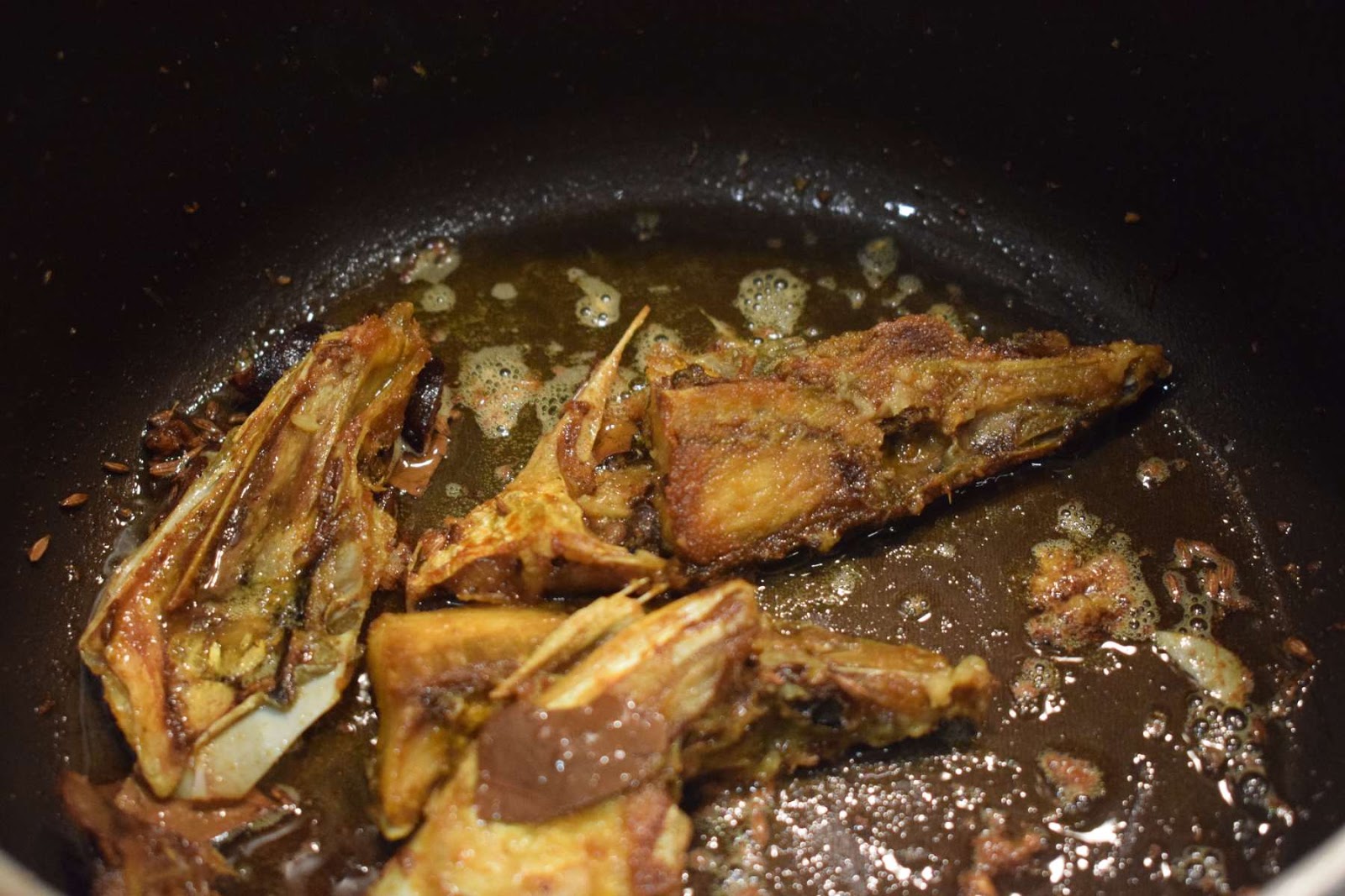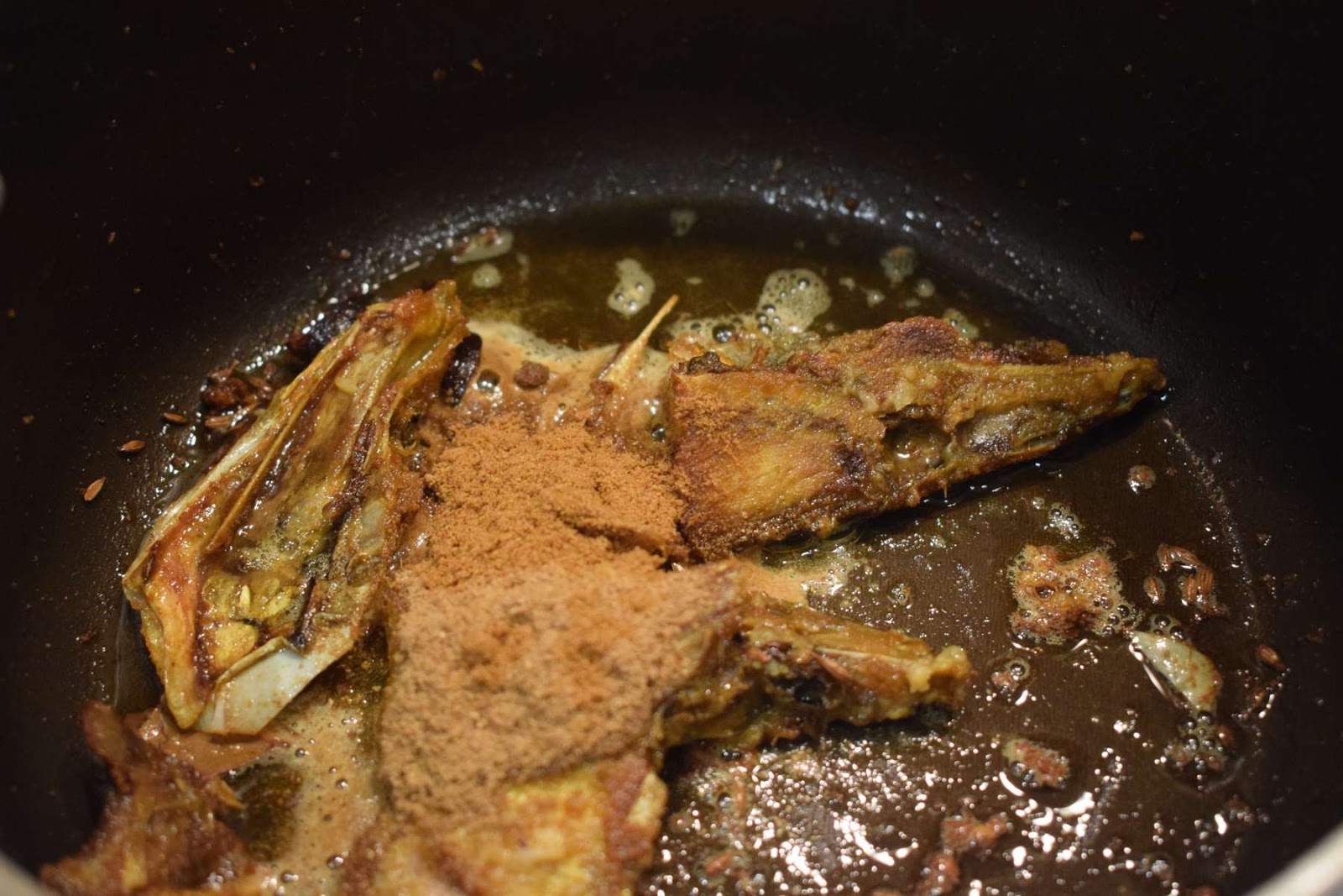 For tempering, I have used whole dry red Chilli, Cumin seeds, Cinnamon sticks, Cloves and Bay leaves. Then I have added Ginger paste and cooked the fried fish head in it. In this preparation, I have added Cumin powder, Coriander powder and Garam Masala powder for flavouring.