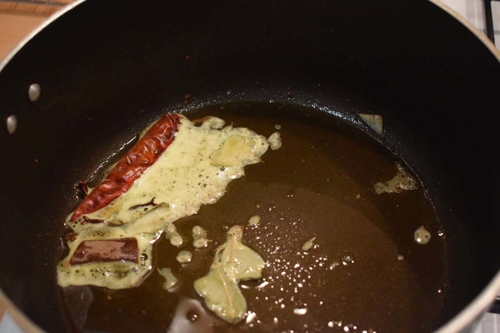 - In the same pan add Cumin seeds, Bay leaf, Cinnamon stick, dry whole red Chilli and Cloves.