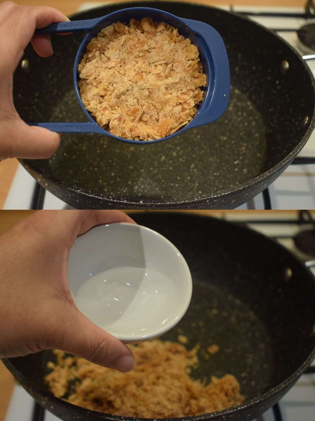 - Add ¼ cup desiccated coconut into the pan and give a quick mix.