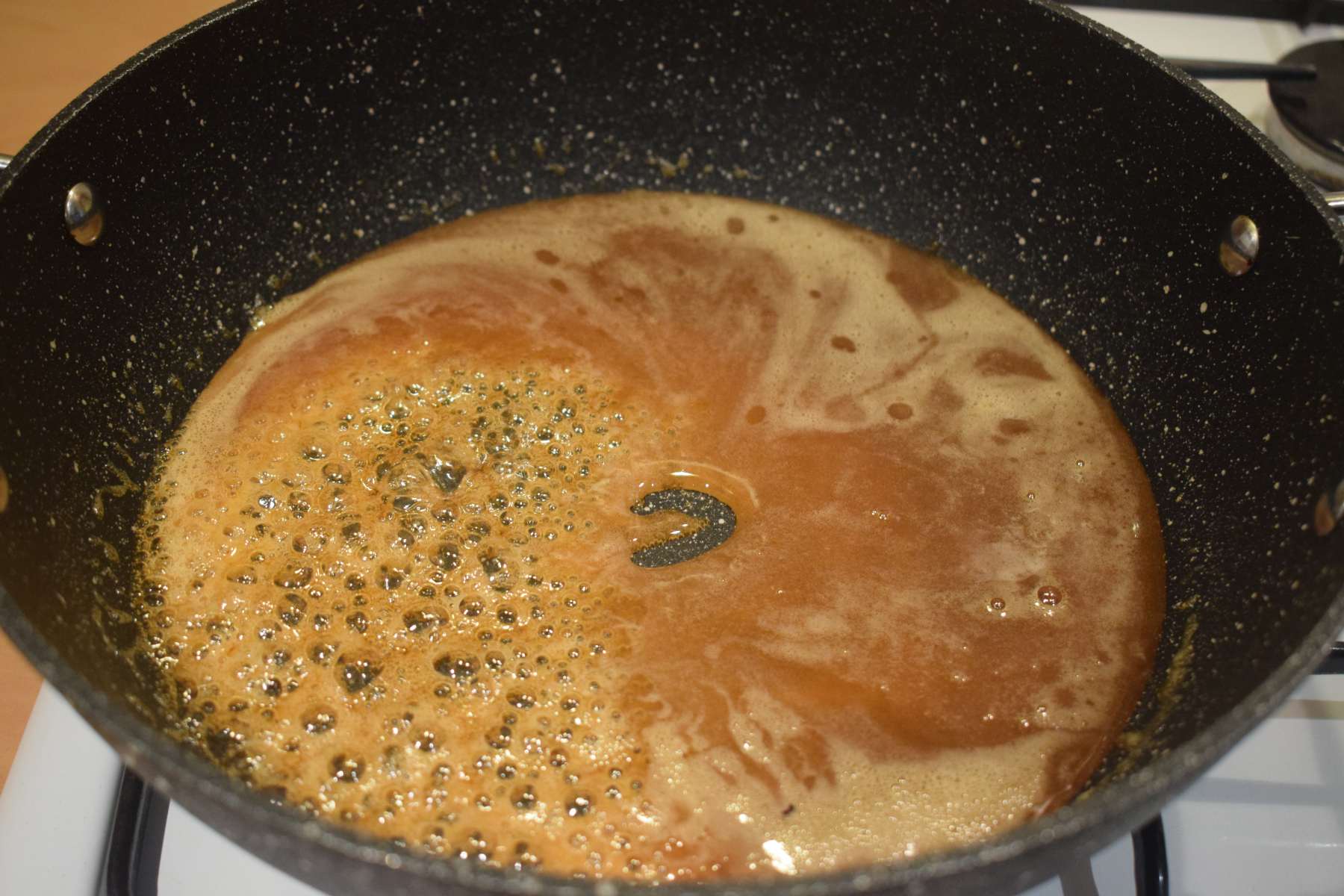 Note: Don’t cook the jaggery on high flame because it may get burnt or stick to the bottom of the pan very quickly. - Once the jaggery get melted and start bubbling, cook it low flame for a minute.
