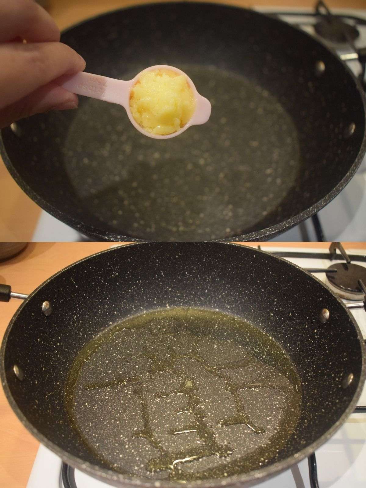 - In the same pan, add 2 teaspoons ghee (Clarified butter) and let the ghee melt.