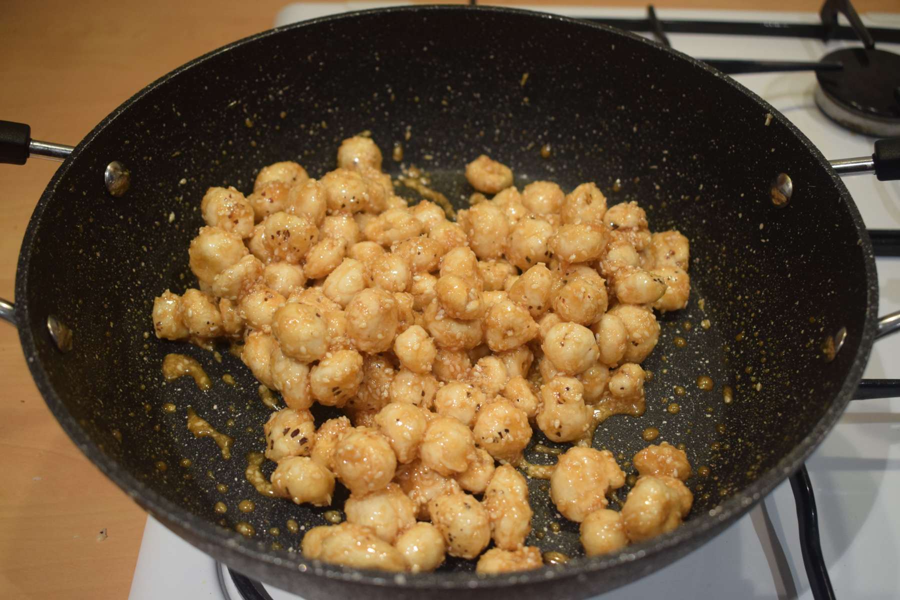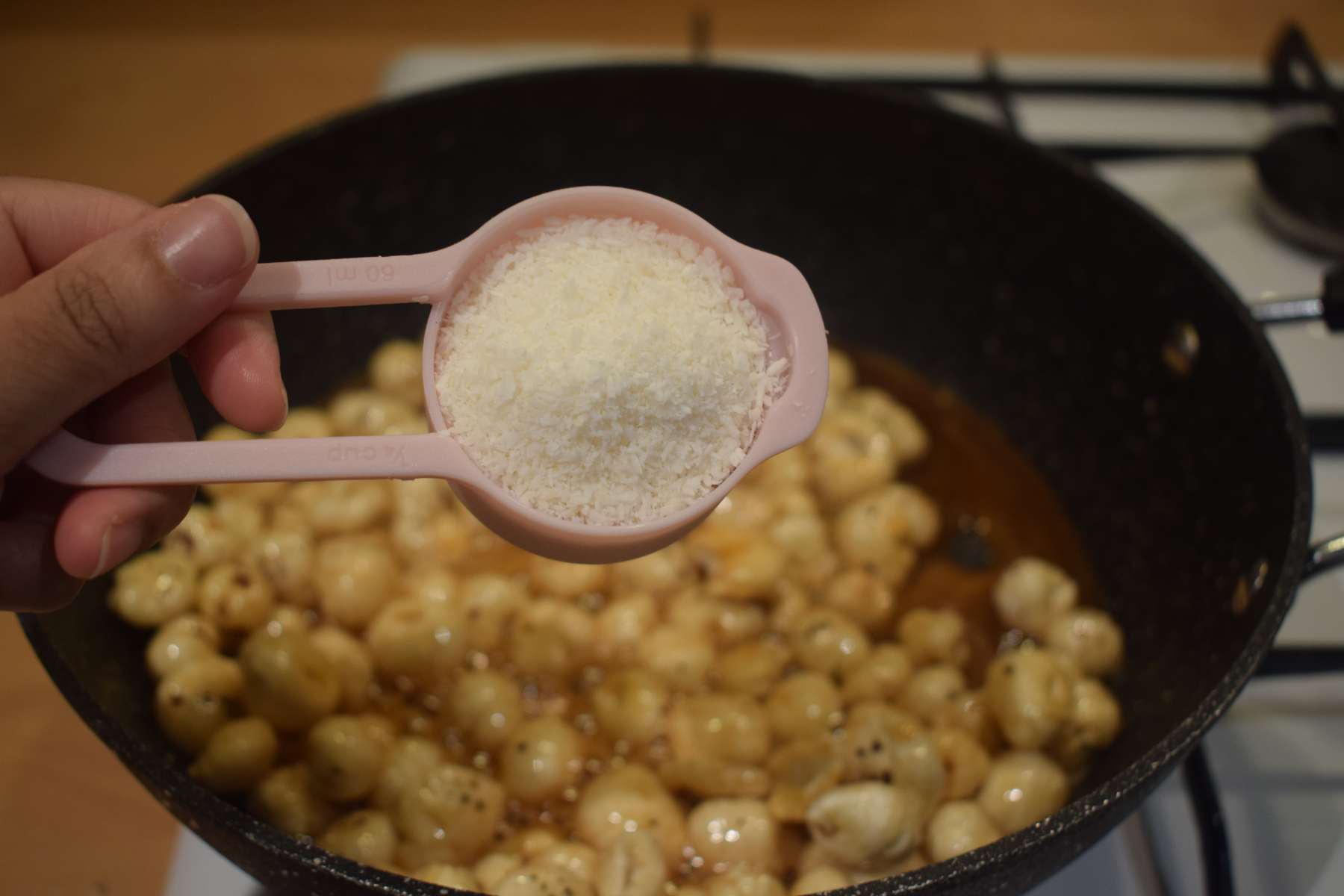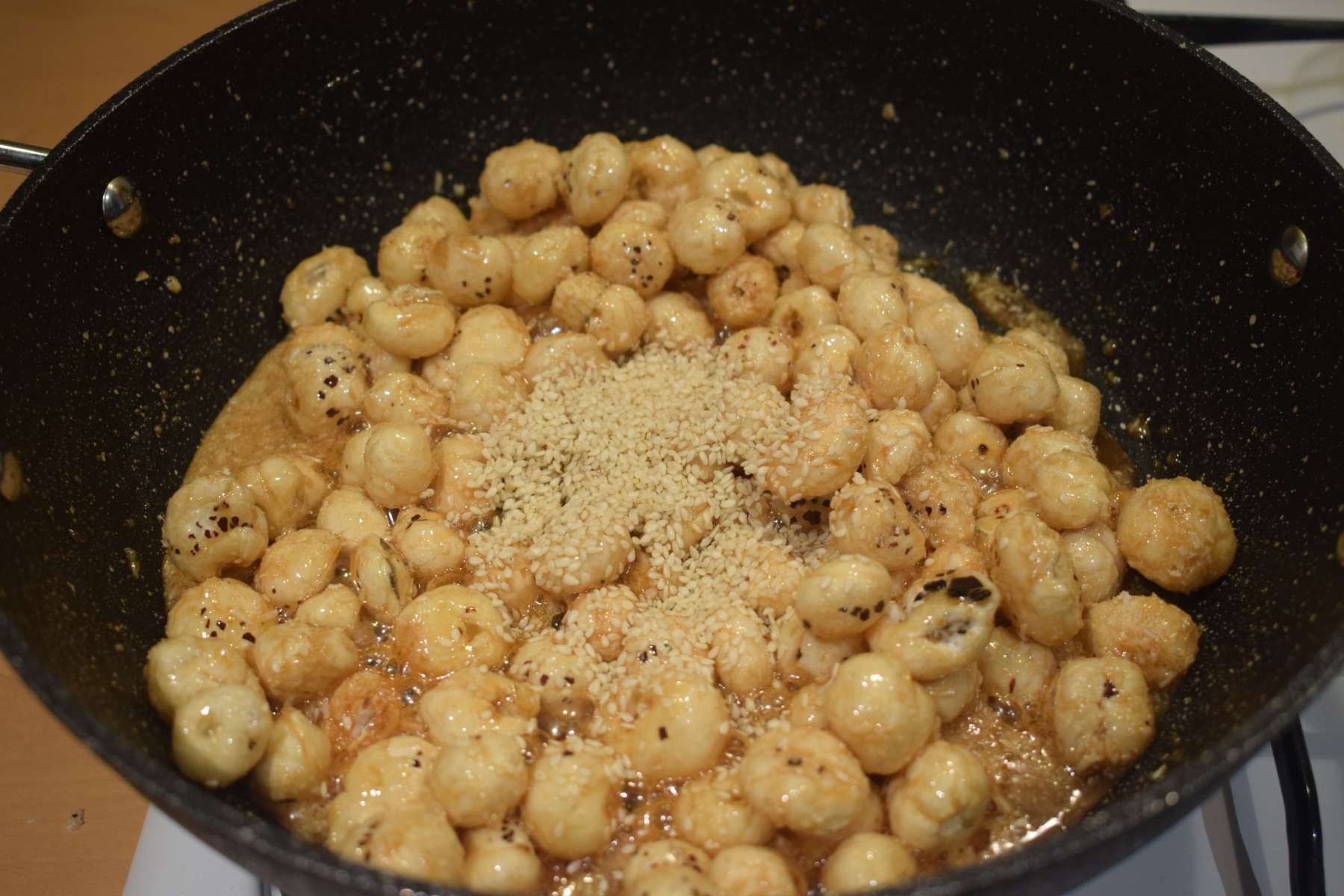 - Add toasted sesame seeds into the pan and give a quick mix. Make sure each makhana gets coated evenly. Stir it until the extra moisture evaporates.