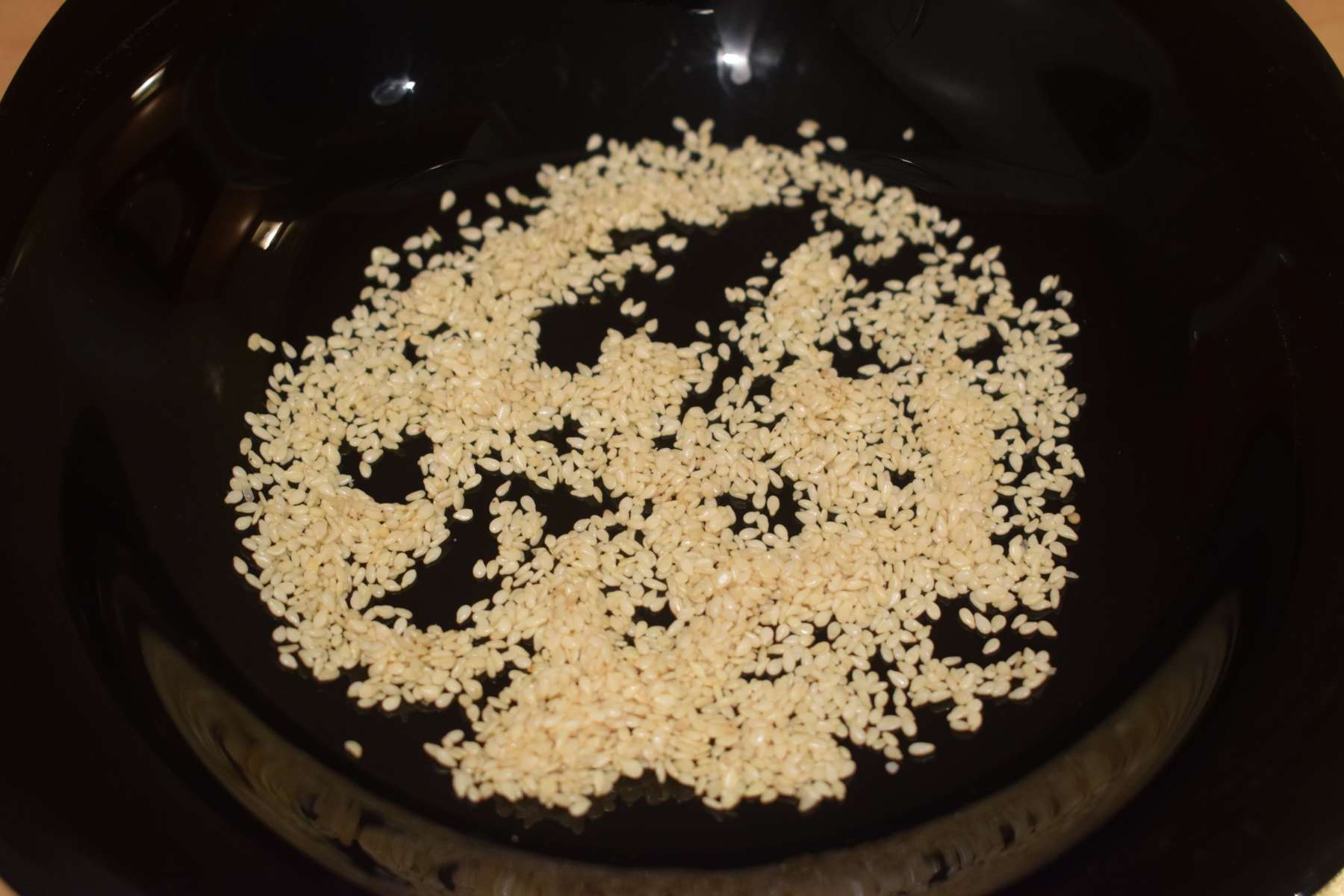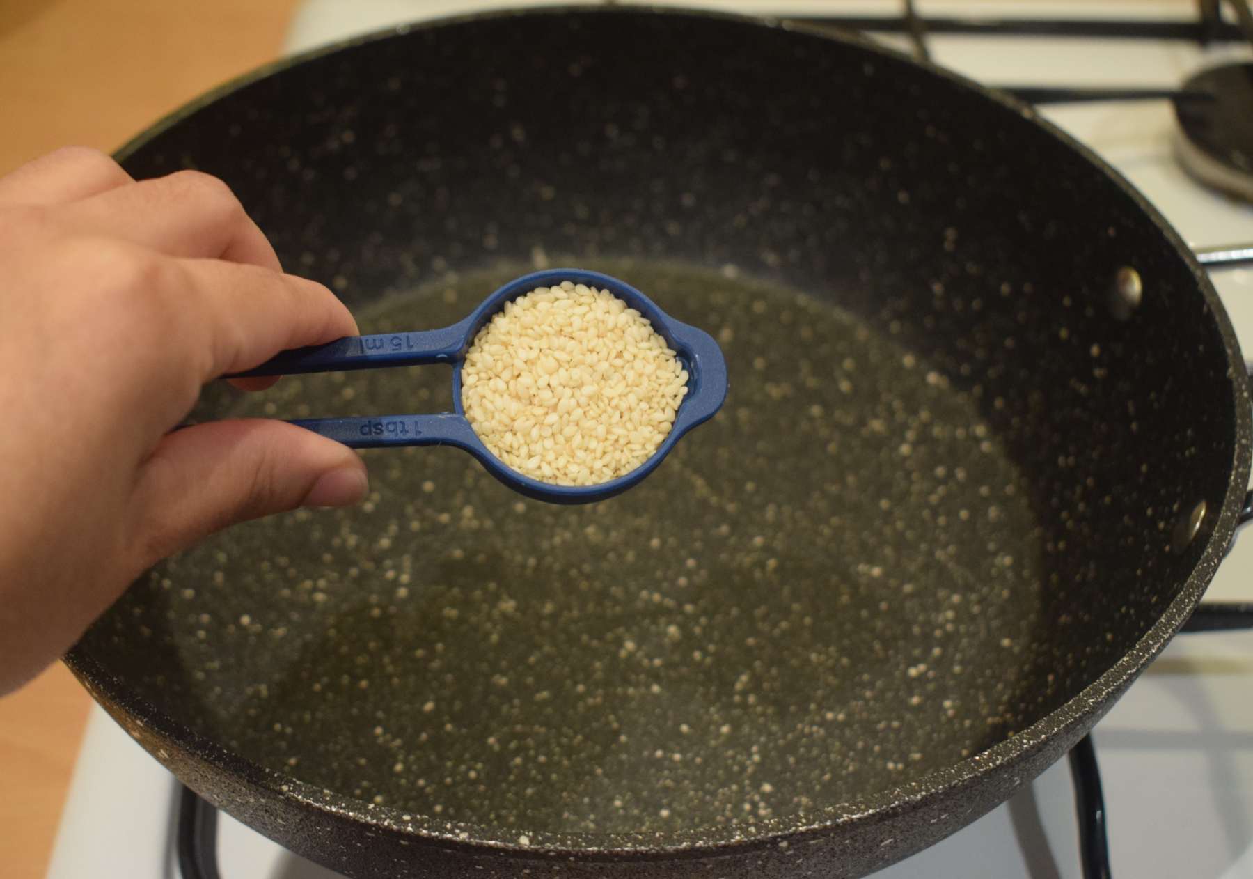 - Put a pan on flame and allow it to become completely dry. Add 1 tablespoon sesame seeds (Til) once the pan is warm and toast it in lowest flame for a 30-40 seconds. Keep it aside. This step enhances the flavour of the sesame seeds.
