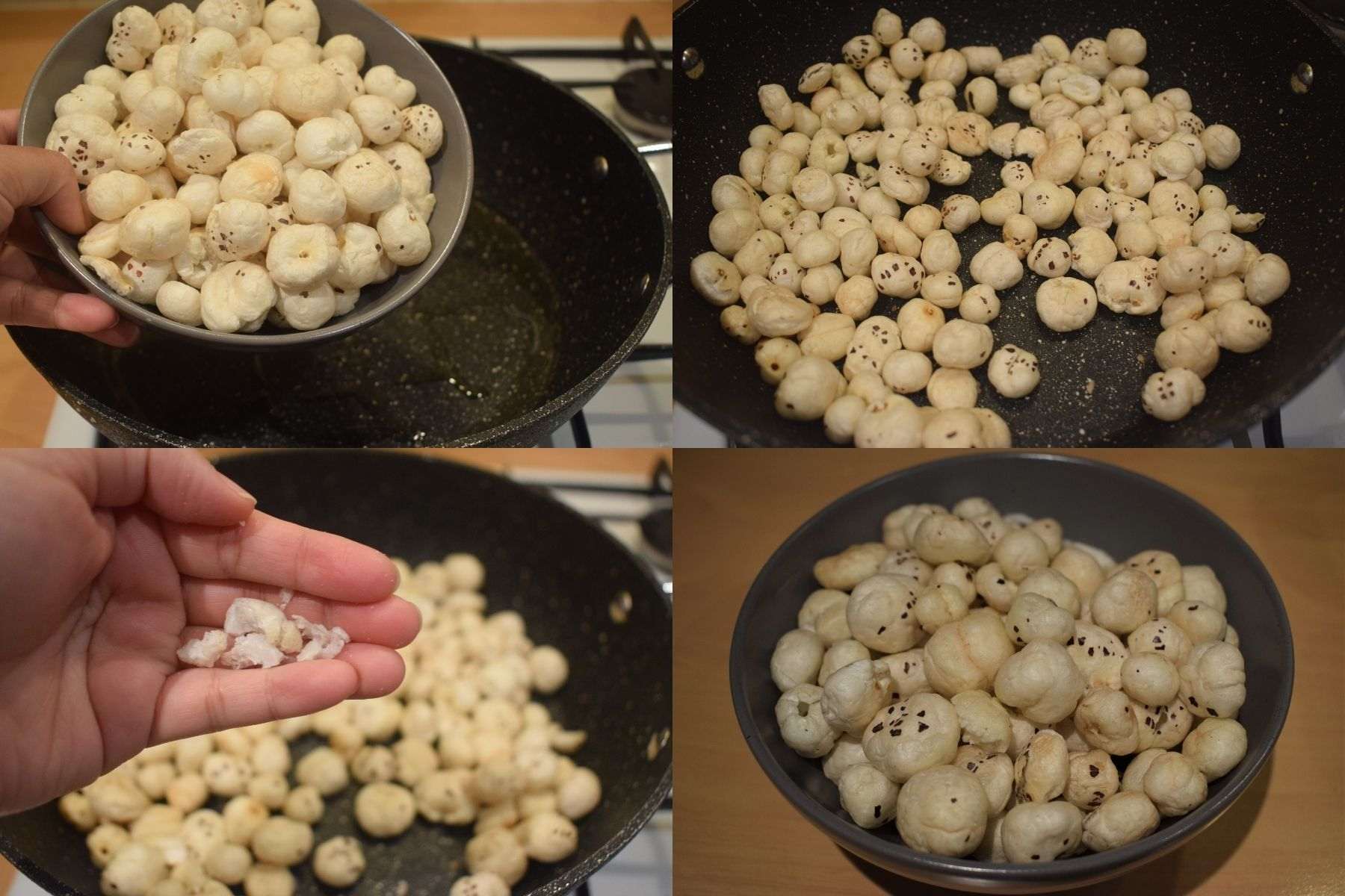 Note: This step takes some time. So be patient and don’t the turn the flame on high or else your makhana may get burnt.