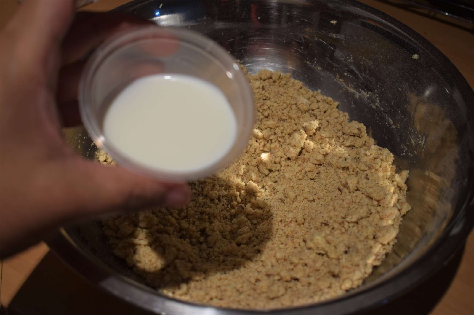 - Add 1-2 tablespoons of milk into the crumble mixture. I have added 1 tablespoon milk to form the dough. Don’t over knead the mixture. Just combine it together to form a biscuit dough.