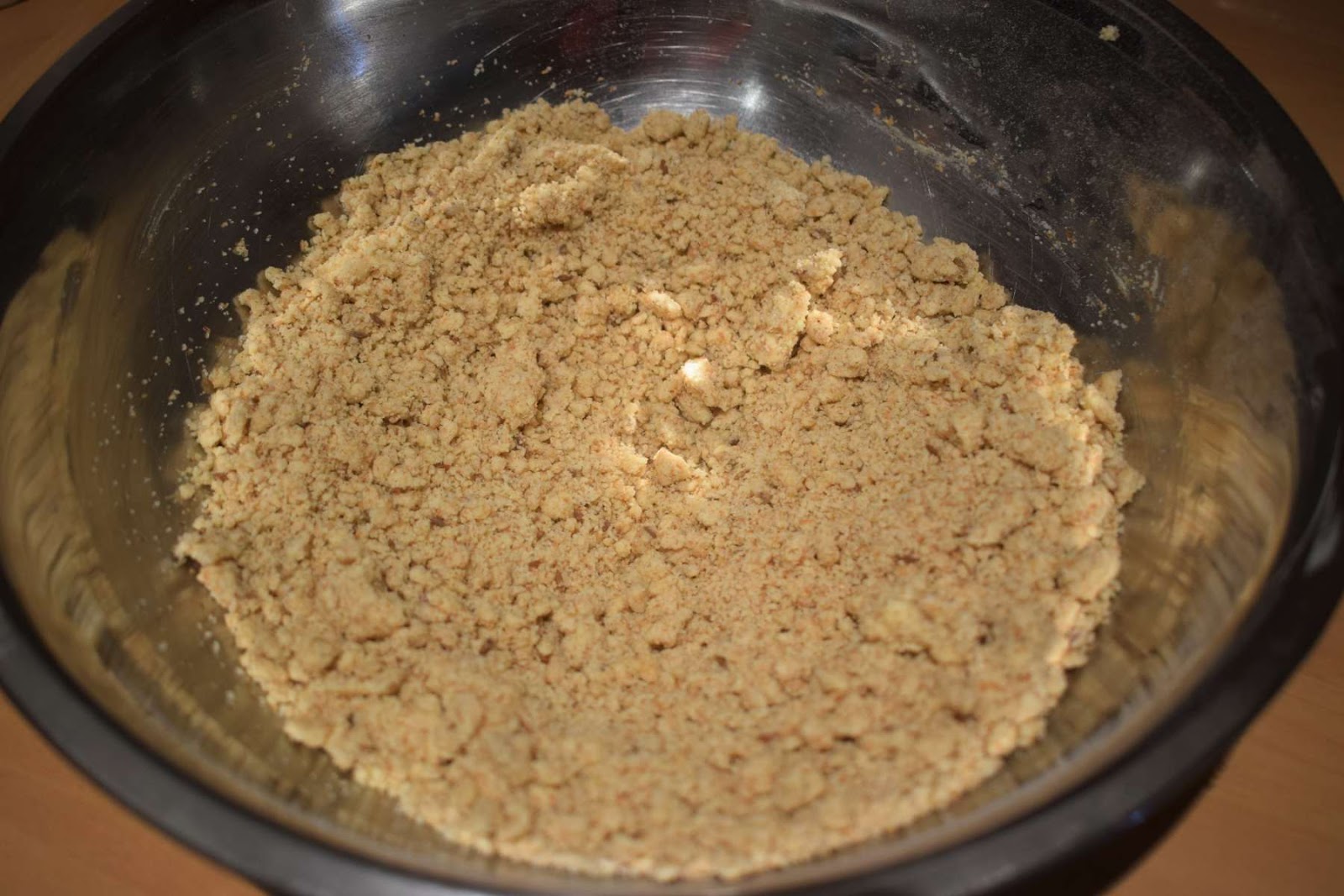 - Add the Wheat flour mixture in four batches to the Butter-Sugar mixture and combine it slowly till crumble texture occurs.